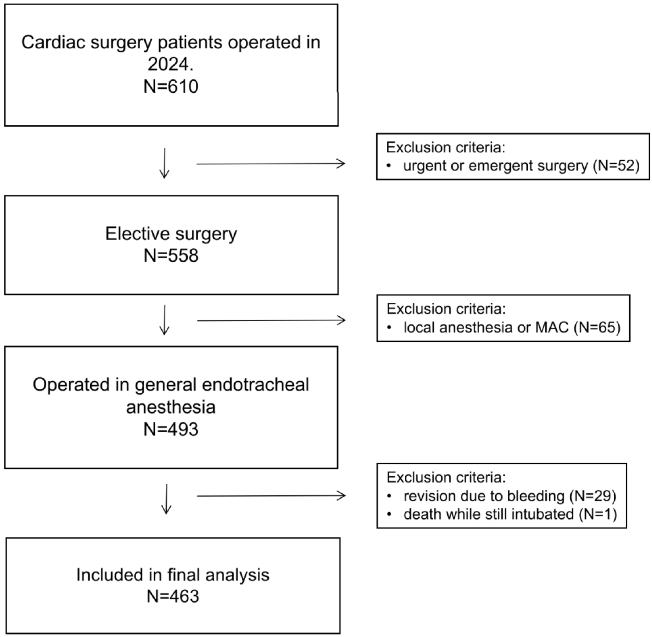 - Kermani, M.S.; Dehesh, T.; Pouradeli, S.; Esmaili, B.S. Factors Affecting the Prolongation of Mechanical Ventilation in Patients after Cardiac Surgery. J. Cardiothorac. Surg. 2025, 20, 104. [Google Scholar] [CrossRef] [PubMed]