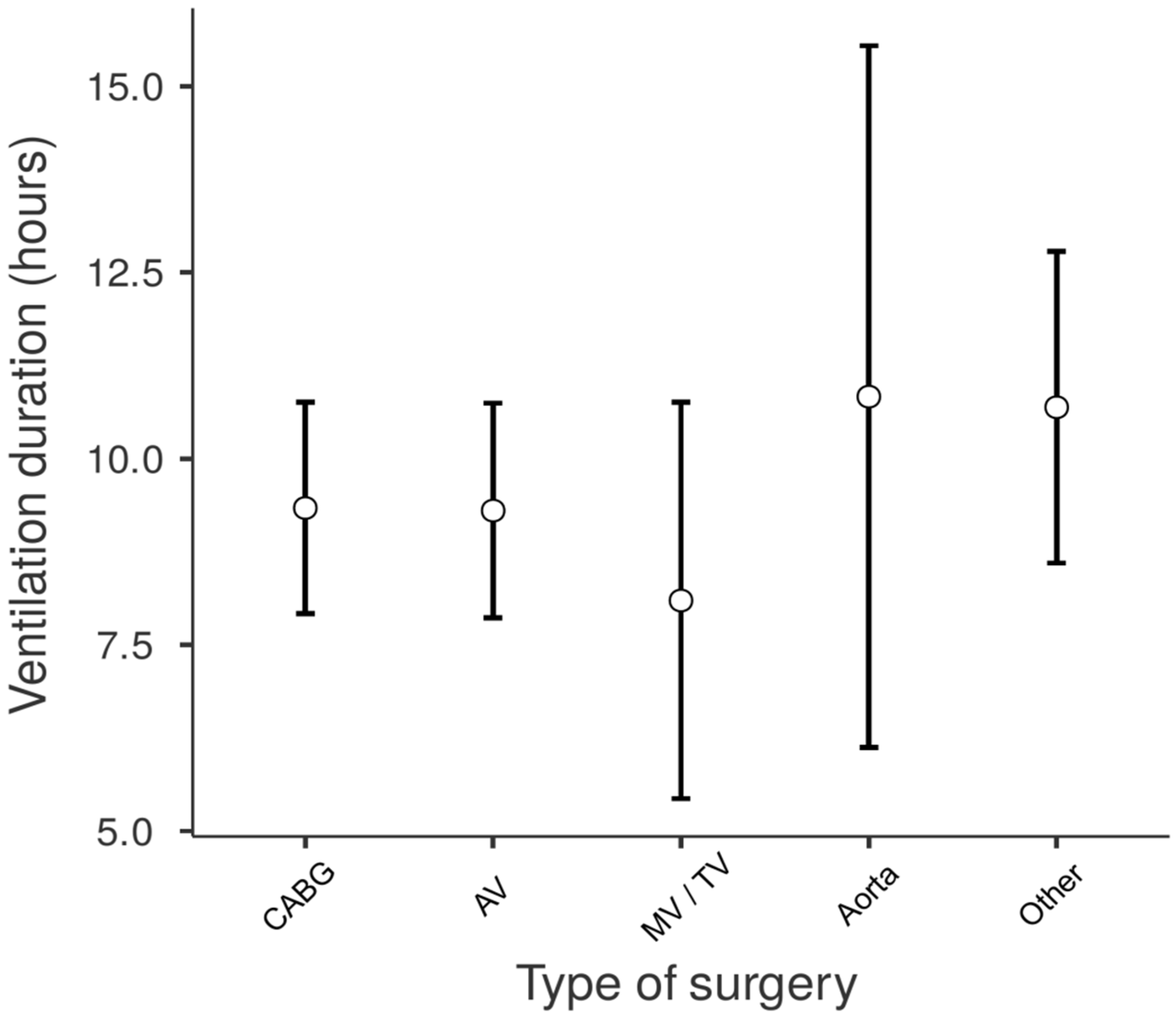 Type of Surgery | Counts (%) | Duration of Mechanical Ventilation (Hours, Median, IQR) |