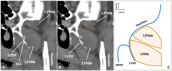 The two-headed configuration of the lateral pterygoid muscle (LPM) observed in sagittal computed tomography angiography (CTA) slices (A,B) and in schematic representation (C). LPMsh = lateral pterygoid muscle, superior head; LPMih = lateral pterygoid muscle, inferior head; LPPP = lateral pterygoid process plate.