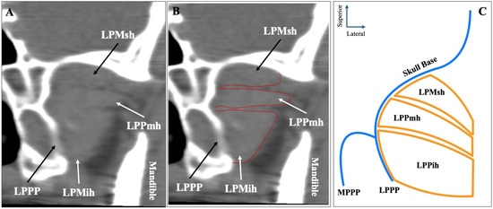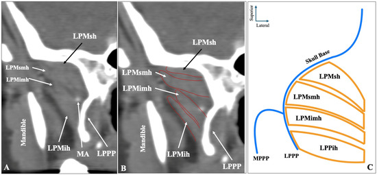 The three-headed configuration of the lateral pterygoid muscle (LPM) is shown in sagittal CTA slices (A,B) and in schematic representation (C). LPMsh = superior head; LPMmh = middle head; LPMih = inferior head; LPPP = lateral pterygoid process plate.