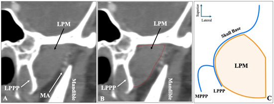 The one-headed configuration of the lateral pterygoid muscle (LPM) recorded in sagittal CTA slices (A,B) and in schematic representation (C). LPPP = lateral pterygoid process plate.