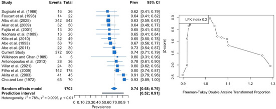 Forest plot and DOI plot for the pooled prevalence of the two-headed lateral pterygoid muscle (LPM). The forest plot (left) displays study-specific prevalence estimates with 95% confidence intervals and weights. The pooled prevalence under a random-effects model was 74.0% (95% CI: 68.0–79.0). Significant heterogeneity was detected (I2 = 78%, p < 0.01). The DOI plot (right) shows an LFK index of +0.2, indicating symmetry and no evidence of small-study effects [6,8,16,17,18,19,20,21,22,23,24,25,26,27,28].