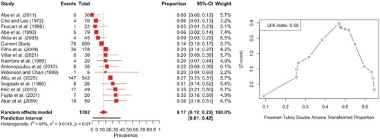 Forest plot and DOI plot for the pooled prevalence of the three-headed lateral pterygoid muscle (LPM). The forest plot (left) displays study-specific prevalence estimates with 95% confidence intervals and weights. The pooled prevalence under a random-effects model was 16.8% (95% CI: 11.6–22.8). Considerable heterogeneity was detected (I2 = 84%, p < 0.01). The DOI plot (right) shows an LFK index of −0.58, indicating symmetry and no evidence of small-study effects [6,8,16,17,18,19,20,21,22,23,24,25,26,27,28].