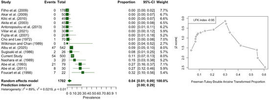 The one-headed LPM was calculated with a pooled prevalence of 4.37% (95% CI: 1.16–8.94). The DOI plot showed an LFK index of −0.95 (no asymmetry), indicating no small-study effect (Figure 8). Similarly, the subgroup analysis of the studies with fewer than 50 subjects and those with more than 50 subjects did not show a significant difference (p = 0.9412). Studies conducted in the European population had a pooled prevalence of 8.83%, compared to 5.06% in the Asian population and 5.06% in the American population, with a statistically significant difference (p < 0.0001). Subgroup analysis based on study type did not produce statistically significant results (p = 0.8140).