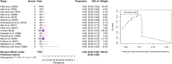 Forest plot and DOI plot for the pooled prevalence of the four-headed lateral pterygoid muscle (LPM). The forest plot (left) displays study-specific prevalence estimates with 95% confidence intervals and weights. Only two studies reported cases of this morphology, yielding a pooled prevalence of <0.01% (95% CI: 0.00–0.12) under a random-effects model. No heterogeneity was detected (I2 = 0%, p = 1.00). The DOI plot (right) shows an LFK index of +0.03, indicating symmetry and no evidence of small-study effects [6,8,16,17,18,19,20,21,22,23,24,25,26,27,28].
