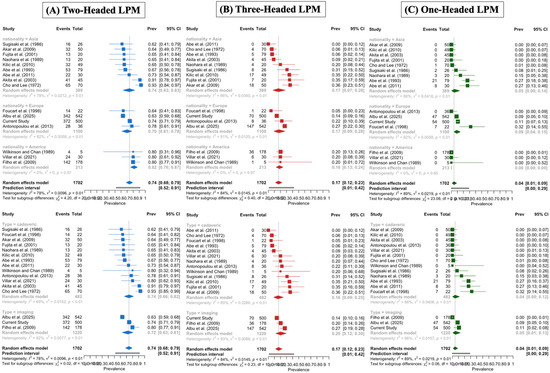 Subgroup analysis of the pooled prevalence of lateral pterygoid muscle (LPM) morphologies (two-headed, three-headed, and one-headed) based on geographical distribution, study type, and sample size. Data are displayed as pooled frequencies (%) from random-effects meta-analysis. p < 0.05 is considered statistically significant. A significant difference was observed in one-headed prevalence by geographical distribution (p < 0.001), with a higher frequency in European studies.