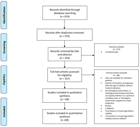 A total of 374 references were identified through the systematic literature search. After screening, 158 articles were selected for full-text review. Of these, two reports were excluded because they lacked individual patient data; one was excluded for reporting an elective termination of pregnancy beyond the threshold of viability without a medical indication; fifteen were excluded due to the absence of histological confirmation, unclear classification of the molar subtype, or negative findings for molar pregnancy; two were excluded as review articles; and sixty-nine were excluded because the pregnancies ended in miscarriage, stillbirth, or termination before fetal viability. The PRISMA Flowchart illustrates the study selection process (Figure 1).