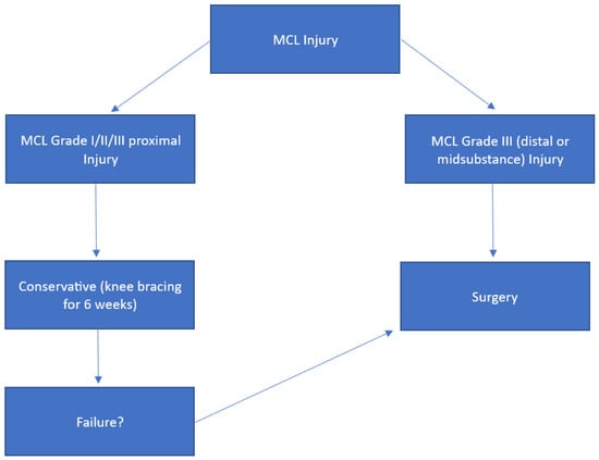 - Encinas-Ullán, C.A.; Rodríguez-Merchán, E.C. Isolated Medial Collateral Ligament Tears: An Update on Management. EFORT Open Rev. 2018, 3, 398–407. [Google Scholar] [CrossRef] [PubMed]