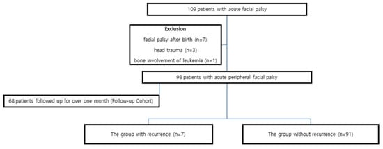 We conducted a retrospective analysis of children under 19 years of age treated for PFP between January 2009 and July 2023. The criteria for inclusion were a diagnosis of acute peripheral PFP and that all the patients were initially treated for PFP in a single medical center. Patients with facial palsy after birth (n = 7), patients with head trauma (n = 3), and a patient with bone involvement of leukemia (n = 1) were excluded from the analysis. Of all the patients included, seven were treated for recurrent PFP. Sixty-eight patients followed up for over one month (the follow-up cohort), in whom clinical outcomes were analyzed.