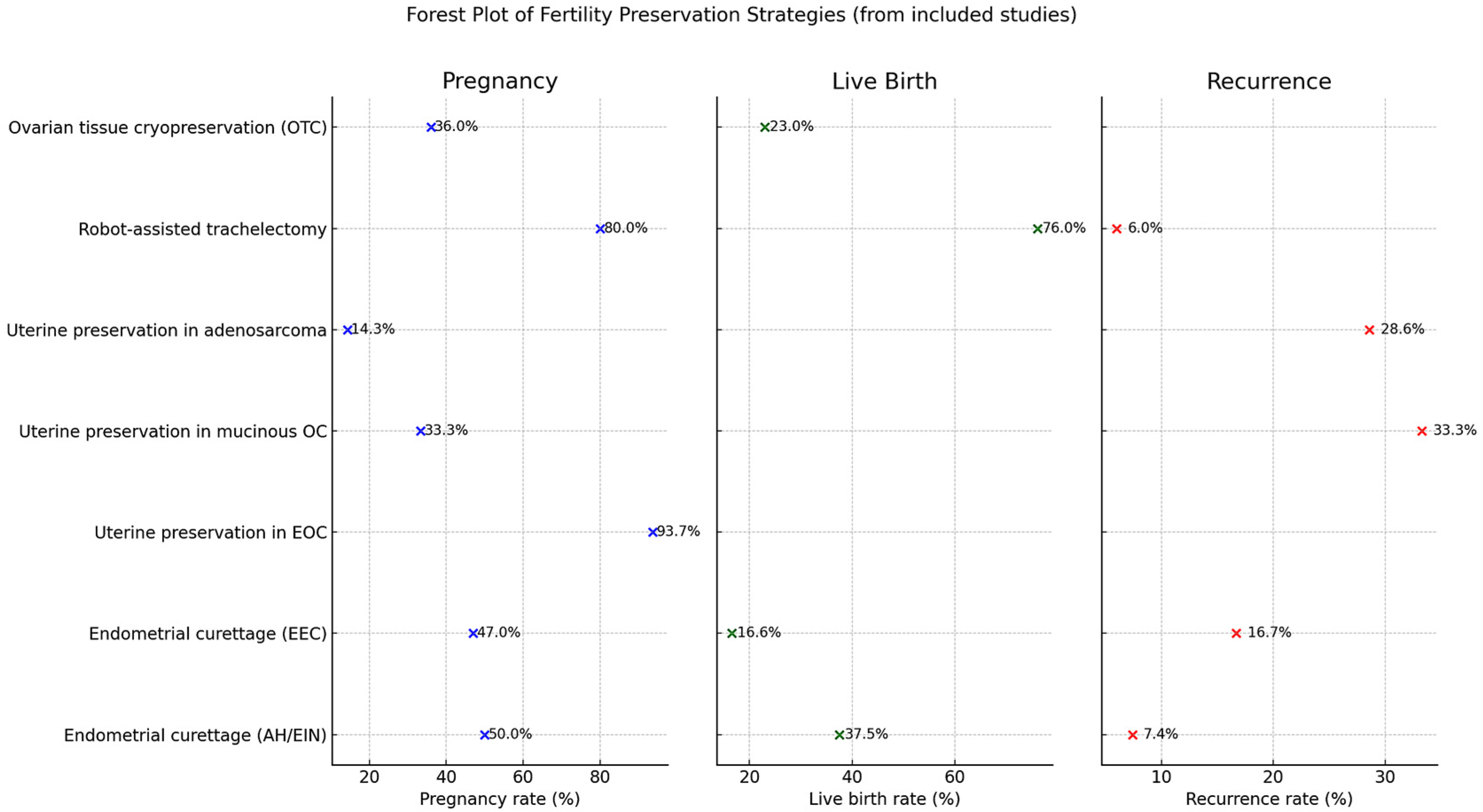 Paper | Method | Malignancy | Sample Size | Pregnancy Rate | Live Birth Rate | Study Duration | Outcomes |
