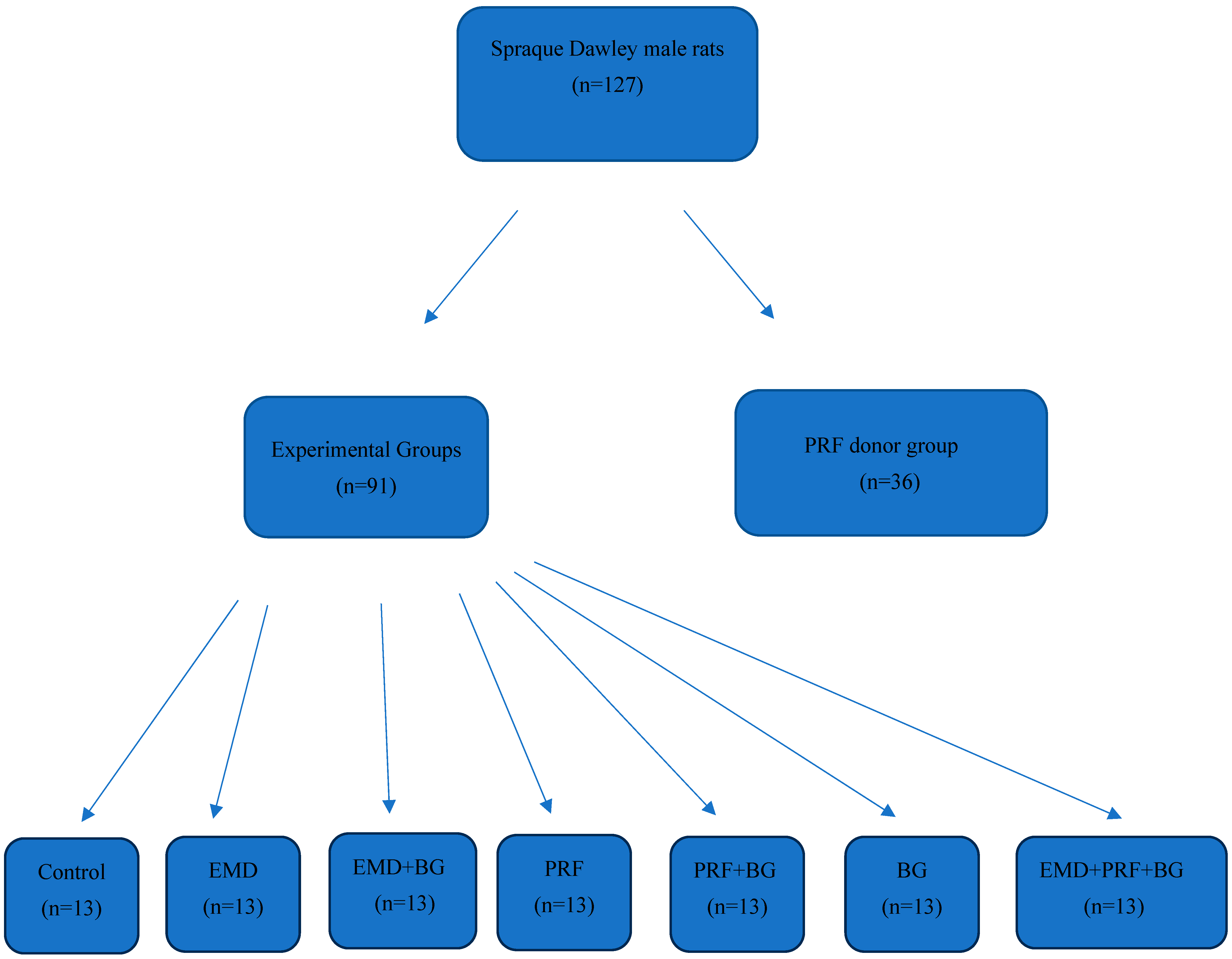 - PRF and Bone Graft Group (PRF + BG, n = 13): Titanium domes filled with a mixture of bone xenograft and PRF derived from the rats’ blood were placed over the decorticated cavities.