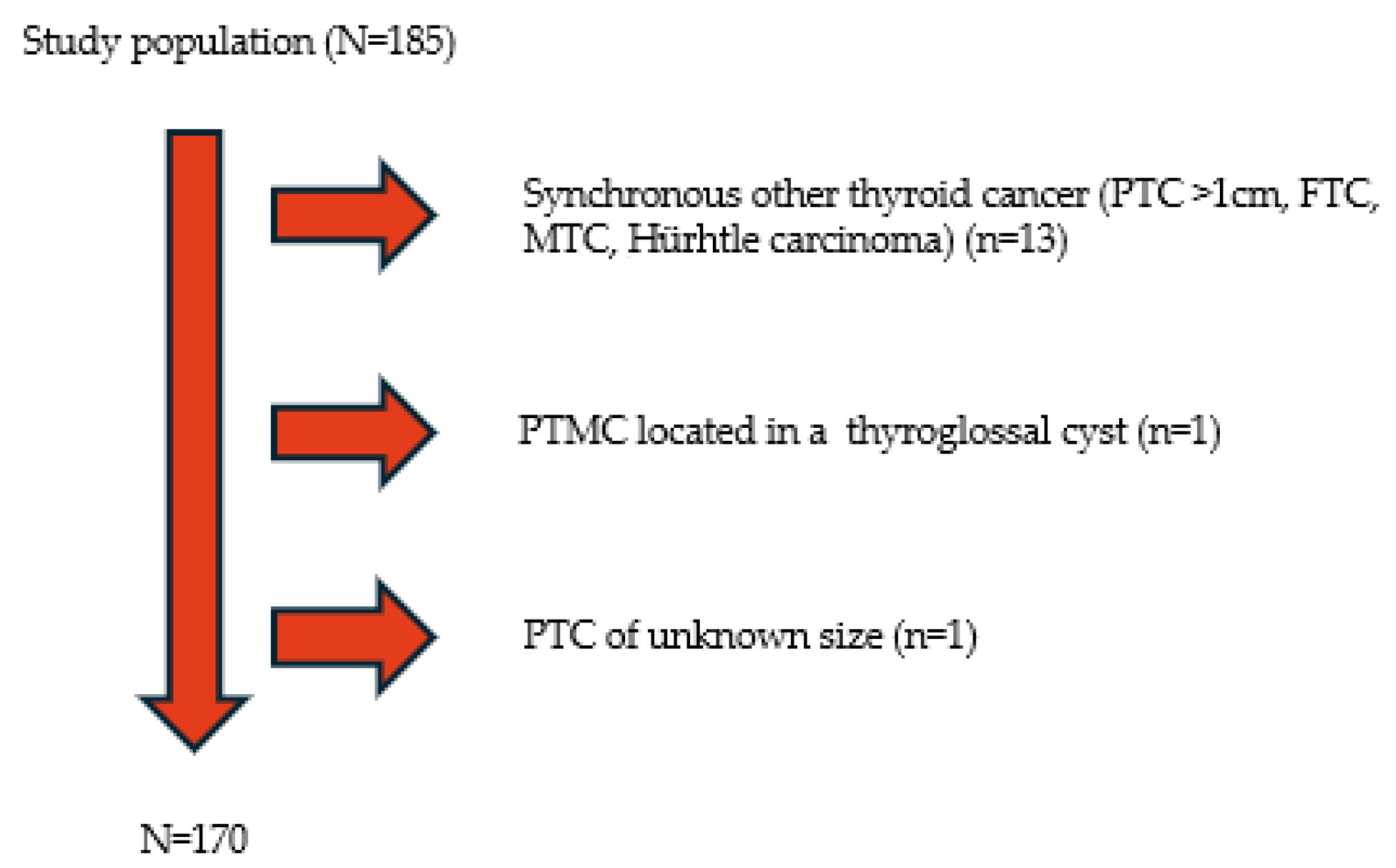 - Liu, C.; Liu, H.; Bian, C.; Yao, X.Y.; Chen, S.J.; Wu, S.P. Preoperative risk factors and recommendations for surgical intervention in cN0 papillary thyroid microcarcinoma. Neoplasma 2021, 68, 1113–1117. [Google Scholar] [CrossRef] [PubMed]