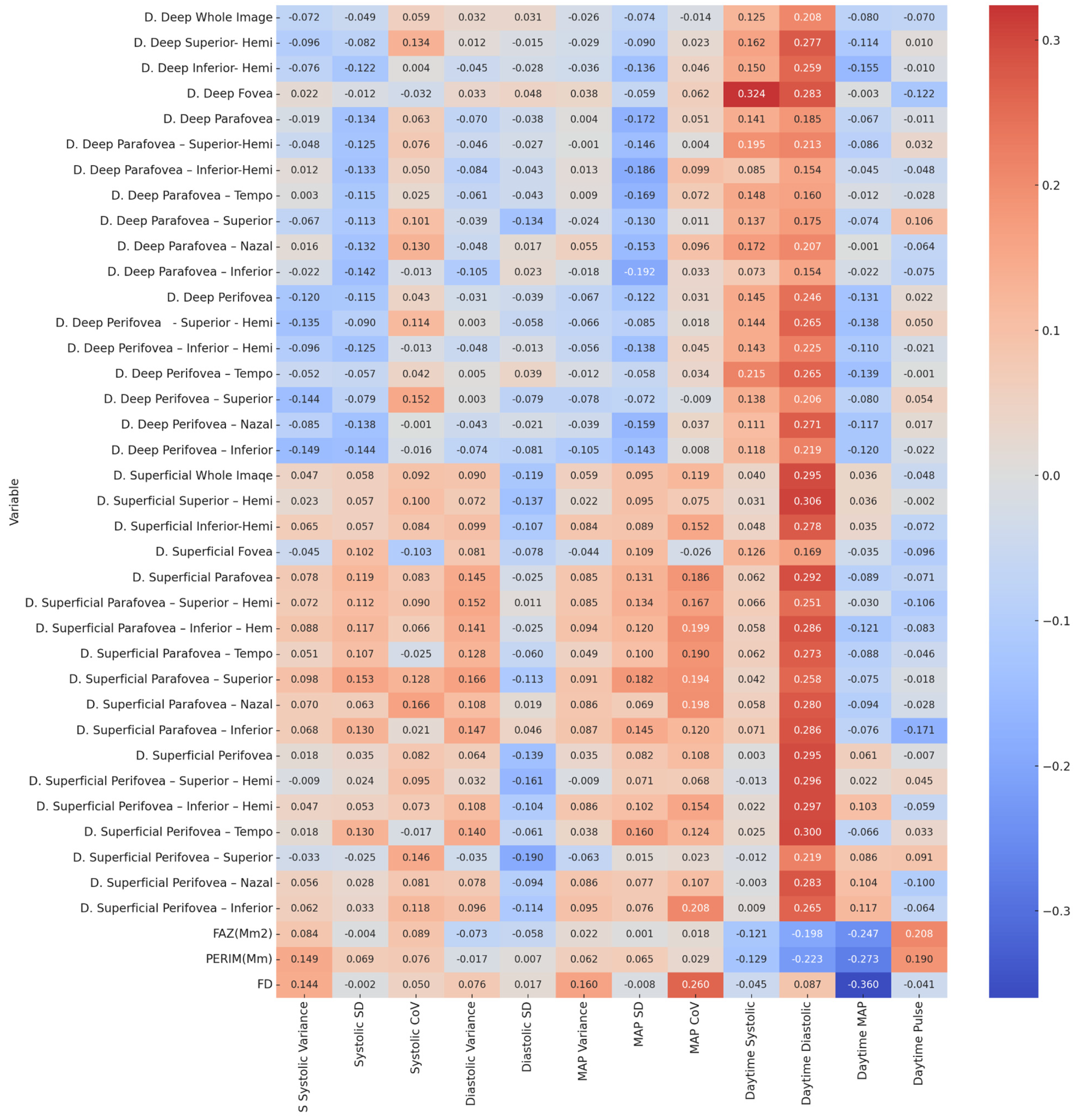 D. Deep Perifovea - Superior - Hemi | 0.306/−0.135 | 0.499/−0.09 | 0.389/0.114 | 0.981/0.003 | 0.662/−0.058 | 0.621/−0.066 | 0.521/−0.085 | 0.890/0.018 |