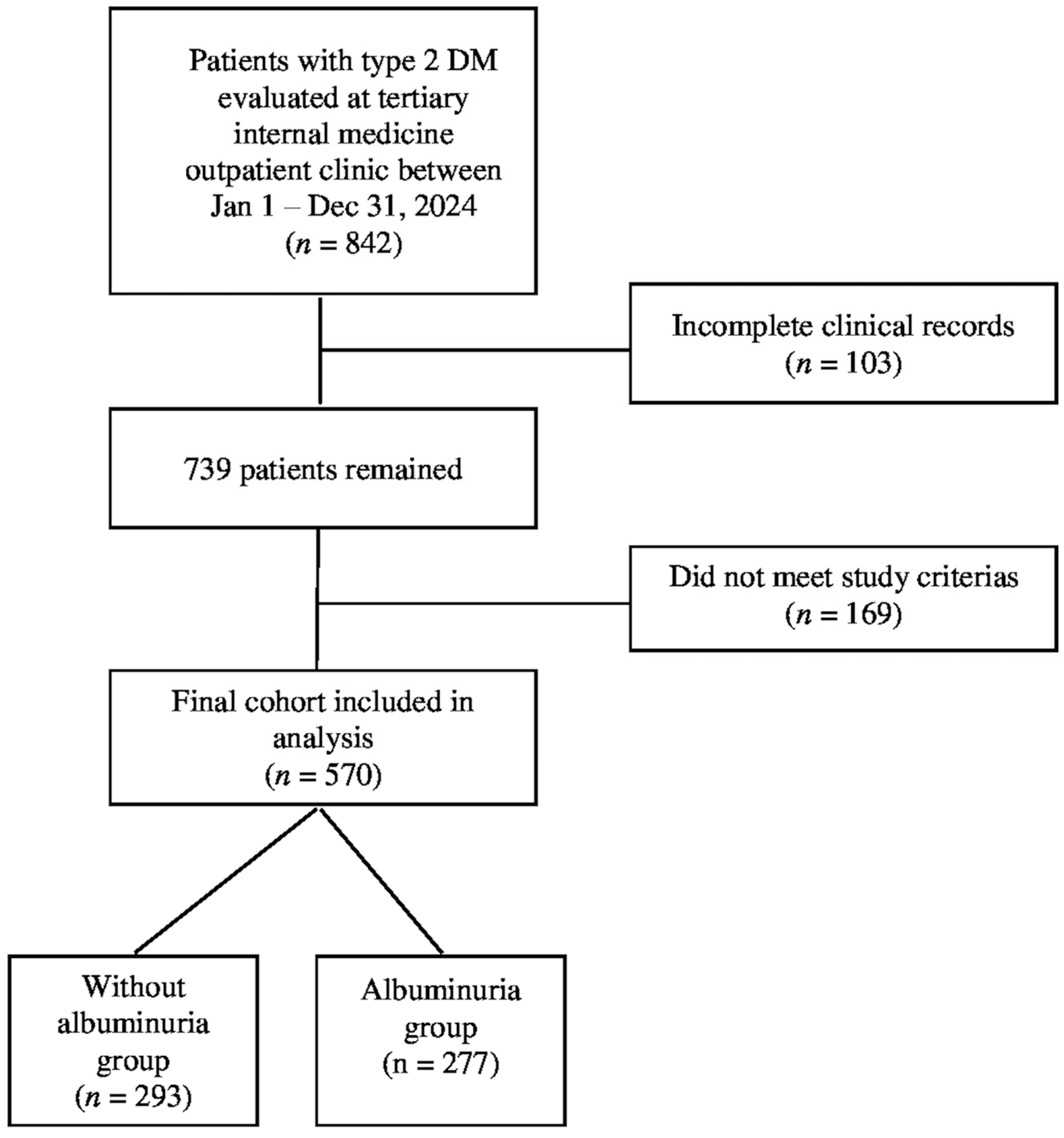 A total of 842 adult patients diagnosed with T2DM were initially screened from the hospital’s electronic medical records. Following the application of the predefined inclusion and exclusion criteria, 272 patients were excluded due to missing essential laboratory data, a diagnosis of non-diabetic kidney diseases, or meeting other exclusion parameters. Consequently, 570 patients with complete clinical and laboratory information were included in the final analysis. The determination of all participants was summarized in Figure 1. The diagnosis of T2DM was confirmed according to the 2024 American Diabetes Association (ADA) guidelines.