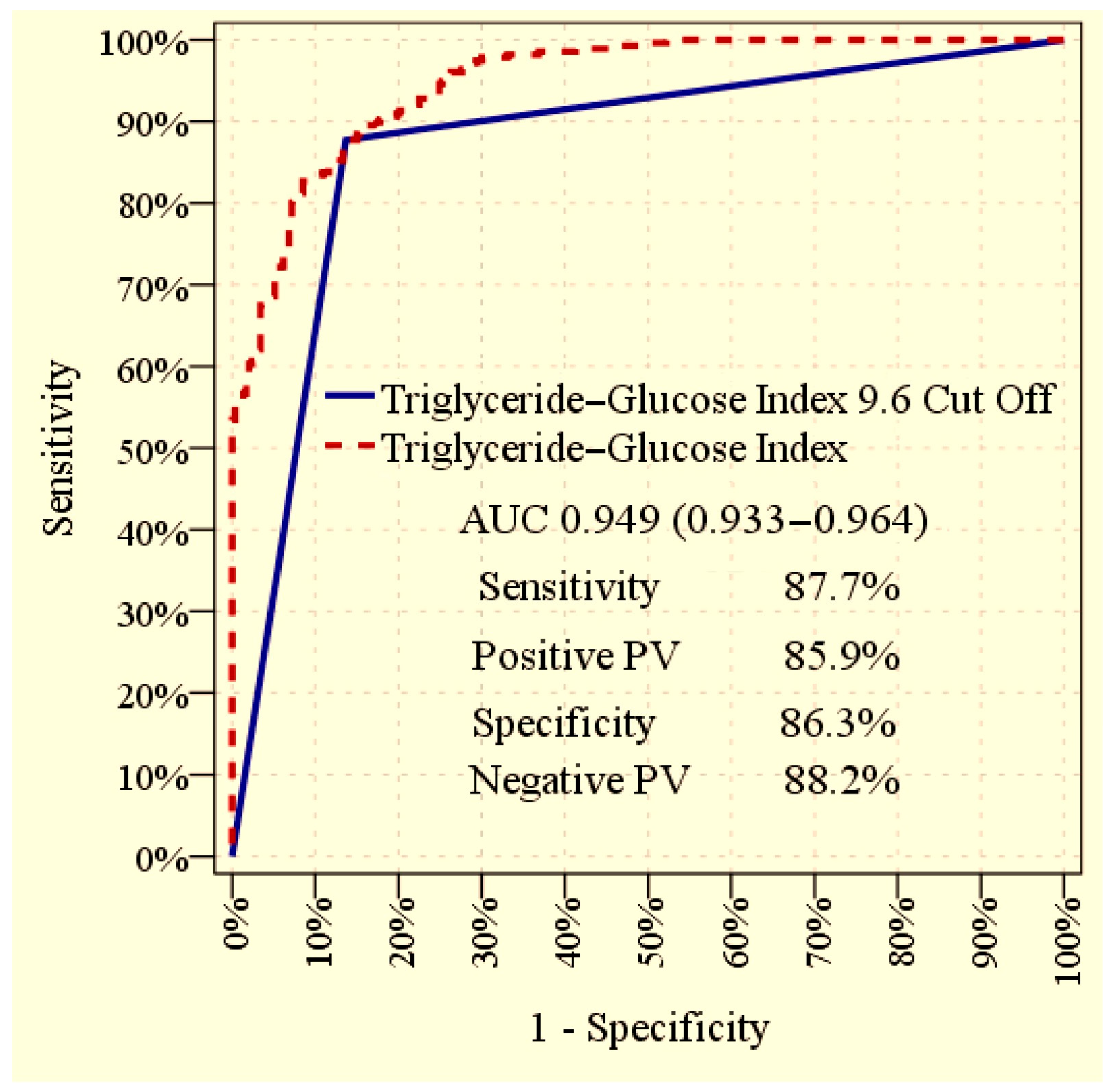 The ROC curve analysis revealed that the TyG index, when evaluated as a continuous variable, demonstrated an excellent ability to discriminate between patients with and without albuminuria, with an AUC of 0.949 (95% CI: 0.933–0.964; p < 0.001). Using the optimal cut-off value of 9.6 derived from the ROC curve, the TyG index maintained a high diagnostic performance, with an AUC of 0.870 (95% CI: 0.839–0.902; p < 0.001). At this cut-off point, the sensitivity was 87.7%, specificity was 86.3%, positive predictive value was 85.9%, and negative predictive value was 88.2% in differentiating albuminuric from non albuminuric patients. The graphical representation of the ROC analysis is displayed in Figure 2.