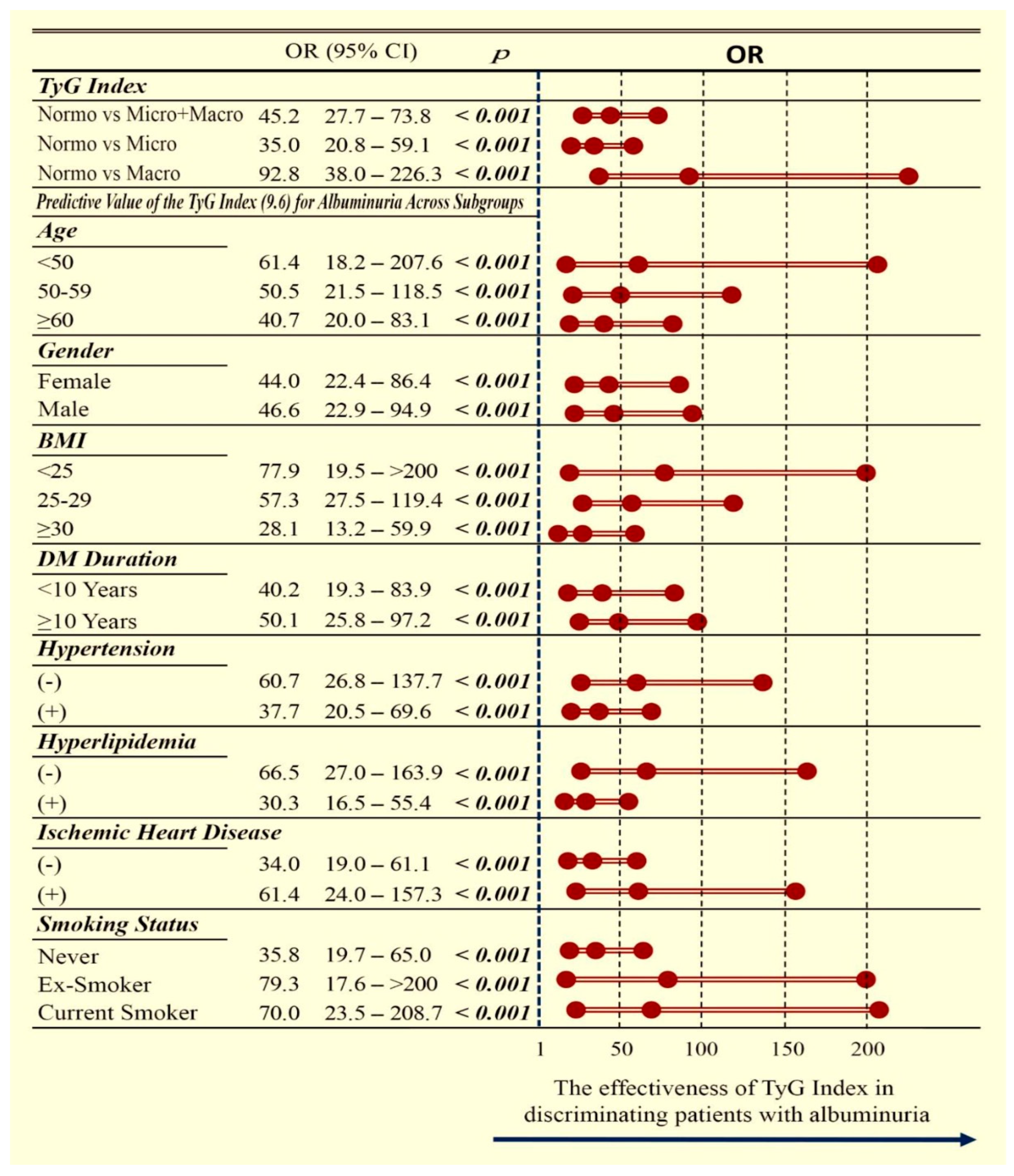 The diagnostic capacity of the TyG index was further substantiated by ROC analysis, which yielded an AUC of 0.949 as a continuous variable. Using a cut-off of 9.6, TyG maintained robust discriminatory ability with an AUC of 0.870, demonstrating high sensitivity and specificity. Importantly, TyG values rose progressively across albuminuria categories from normoalbuminuria to microalbuminuria and macroalbuminuria, indicating a graded association with the severity of renal involvement. Subgroup analyses, illustrated by forest plots, confirmed that the predictive value of TyG was consistent across clinically relevant strata, including age, sex, BMI, diabetes duration, hypertension, hyperlipidemia, coronary artery disease and smoking status. The absence of effect modification across these categories suggests that the observed association is robust and may be generalizable. Collectively, these findings demonstrate the strong diagnostic accuracy of TyG and support its potential integration into risk stratification models for early diabetic kidney disease.