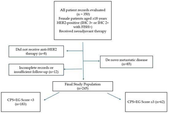 - Marmé, F.; Solbach, C.; Michel, L.; Schneeweiss, A.; Blohmer, J.-U.; Huober, J.; Fasching, P.A.; Jackisch, C.; Nekljudova, V.; Link, T. Utility of the CPS+ EG scoring system in triple-negative breast cancer treated with neoadjuvant chemotherapy. Eur. J. Cancer 2021, 153, 203–212. [Google Scholar] [CrossRef]