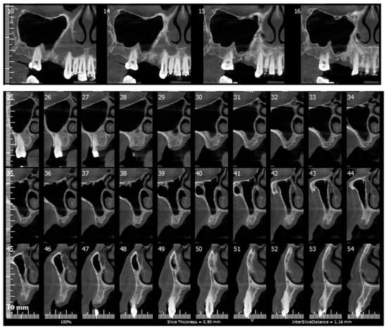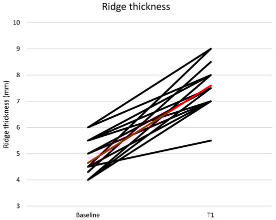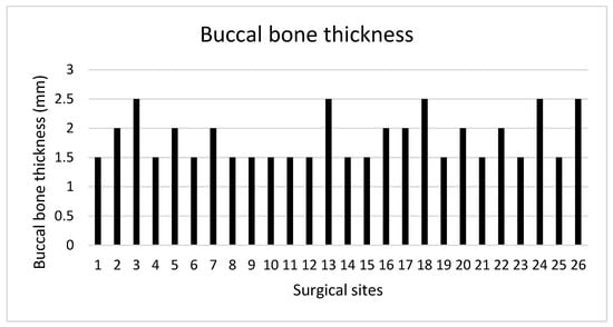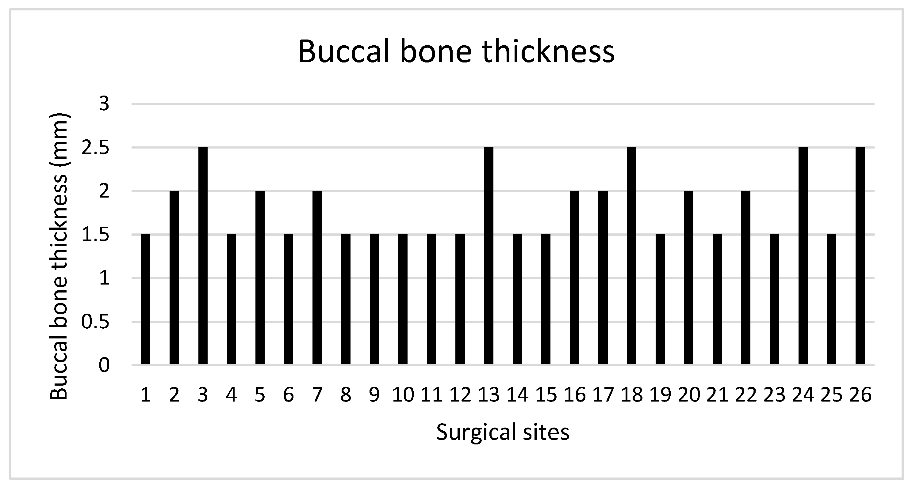 A total of 13 surgical sites were characterized by a BBT < 2 mm, whereas the remaining 12 showed a BBT ≥ 2 mm.