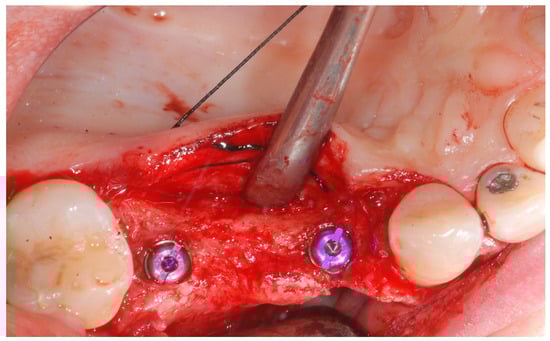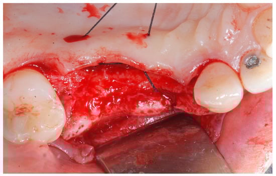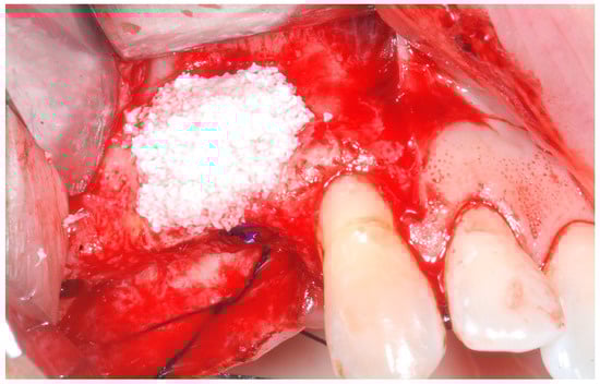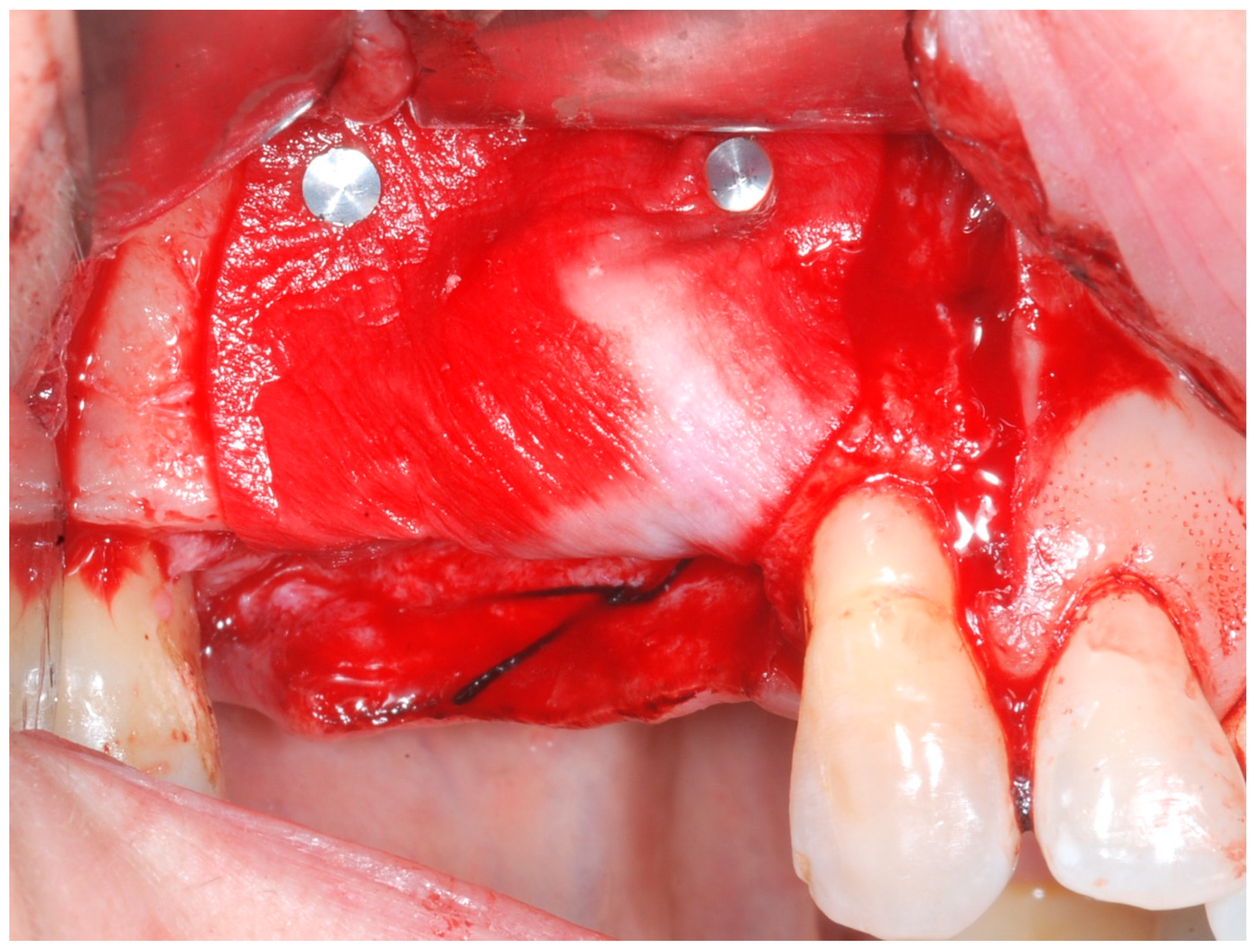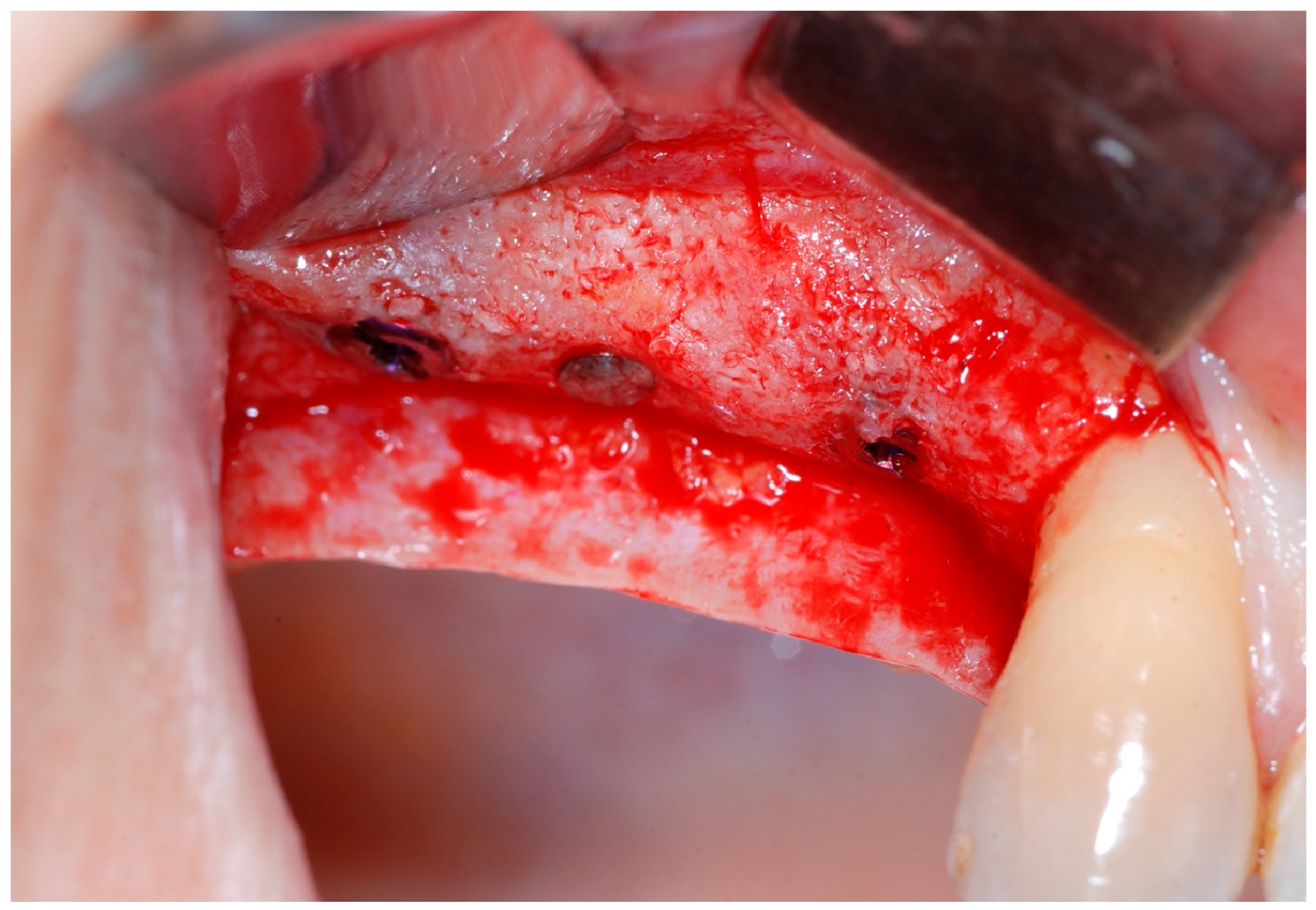 Figure 5). A collagenous resorbable membrane (T-Gen, HYUNDAI BIOLAND Co., Ltd., 162, Gwahaksaneop 3-ro, Ochang-eup, Cheongwon-gu, Cheongju-si, Chungcheongbuk-do, 28125, Republic of Korea) was shaped and trimmed to cover the graft and to extend 2–3 mm onto the intact bony borders of the defect. The membrane was hydrated and the fixation was accomplished using fixation pins (MC Bio S.r.l., Como, Italy) (