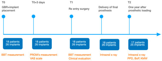 Overall, 20 subjects were initially scheduled. Two of them refused to undergo bone augmentation procedures and opted for a removable prosthesis. A total of 18 participants with 26 implants examined were included in this study, with 21 (80.77%) being female and 5 (19.23%) male. The mean age of the participants was 62.96 ± 12.30 years, ranging from 32 to 78 years at the time of the surgical phase. Implant diameters ranged from 3.5 to 4 mm. During the study period, one dropout was recorded after delivery of the prosthesis. This patient moved to another city and was not available for the follow-up examinations, therefore only data up to T1 were taken into considerations. In the end, 25 surgical sites were evaluated (
