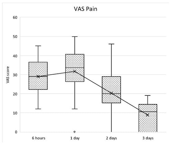 Box plot of VAS pain scores at different study intervals. The horizontal line inside each box represents the median value, while the box edges indicate the interquartile range (25th–75th percentile). The whiskers represent the minimum and maximum values. The dotted line connects the mean values at each time point to illustrate the overall trend.