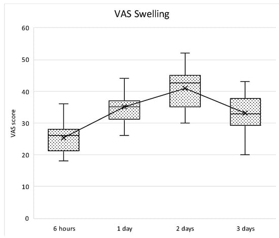 p = 0.006). Similarly, swelling perception normally increased within the first two post-operative days with a peak at 48 h, and then decreases thereafter. In all time points, the differences were statistically significant (