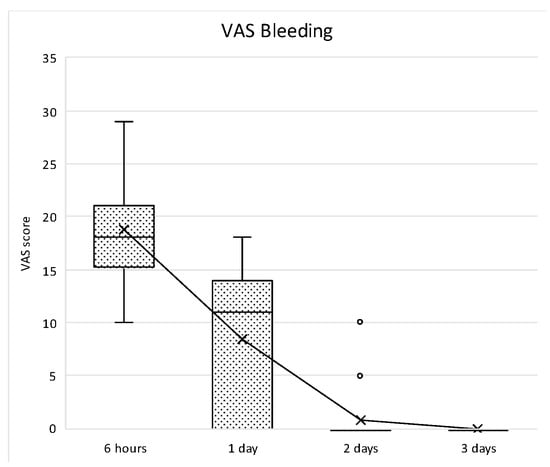 Bleeding perception was high during the first 24 h, and then decreased thereafter, reaching no bleeding perception at day 3. After the peak at 6 h, the decrease was statistically significant up to the second post-surgical day (