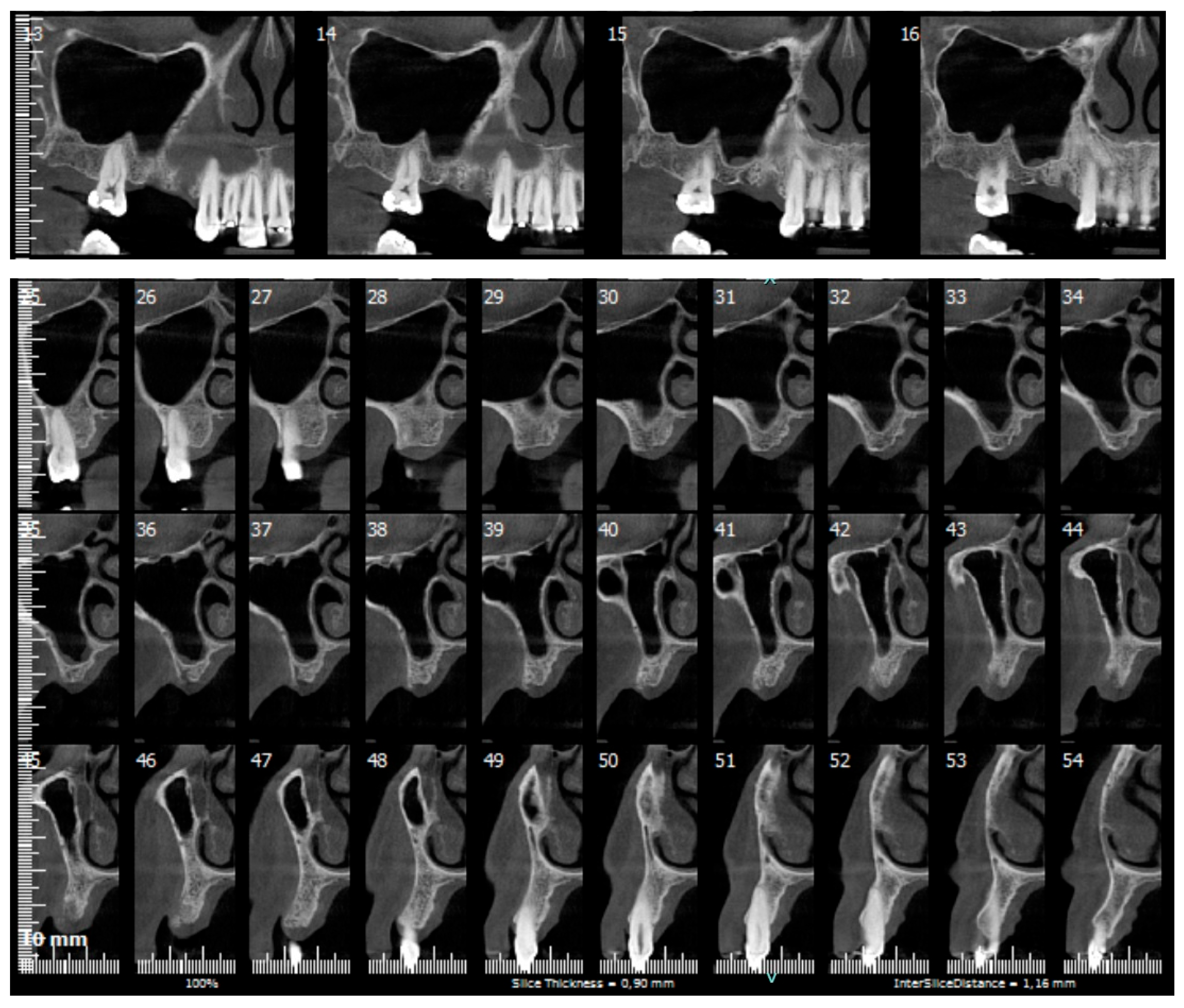 During the 6-month period from T0 to T1, healing proceeded uneventfully in all patients, with no major complications or biocompatibility issues. No allergic reactions were observed. No complications such as flap dehiscence, membrane exposure, wound infection, fistulae with pus discharge, or foreign body reactions were noticed. None of the surgical sites had to be re-opened earlier. During the re-entry phase, in each surgical site no membrane remnants could be detected. Augmented newly formed hard tissue was observed clinically, with macroscopic features of healthy, bleeding, newly formed bone. Remnants of DBBM granules were occasionally visible and appeared firmly attached to the regenerated hard tissue, with no macroscopic signs of fibrous encapsulation. A thin layer of pseudo-periosteum with a thickness < 1 mm was seldomly observed. In all cases, implants appeared clinically stable, with no residual bony dehiscences or fenestrations at the buccal aspect.