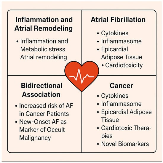 Mechanistic Links Between Atrial Fibrillation and Cancer. This schematic illustrates the interplay between cancer-related processes and atrial fibrillation (AF) development. The top-left quadrant highlights the role of inflammation and metabolic stress in promoting atrial remodeling. The top-right focuses on direct AF mechanisms, including cytokine signaling, inflammasome activation, and epicardial adipose tissue expansion. The bottom-right outlines cancer-specific contributors such as cardiotoxic therapies and emerging biomarkers (e.g., galectin-3, IL-6). The bottom-left emphasizes the bidirectional association: cancer increases AF risk, and NOAF may act as a paraneoplastic indicator. The central heart icon symbolizes the shared cardiovascular-inflammatory axis between AF and malignancy.