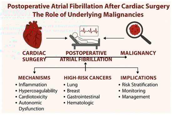 This review aims to (A) emphasize the association between cancer and POAF, (B) explore the underlying pathophysiological mechanisms linking malignancy and arrhythmogenesis, (C) evaluate prognostic implications in cancer patients undergoing cardiac surgery, and (D) propose multidisciplinary strategies for effective screening, prophylaxis, and postoperative management.