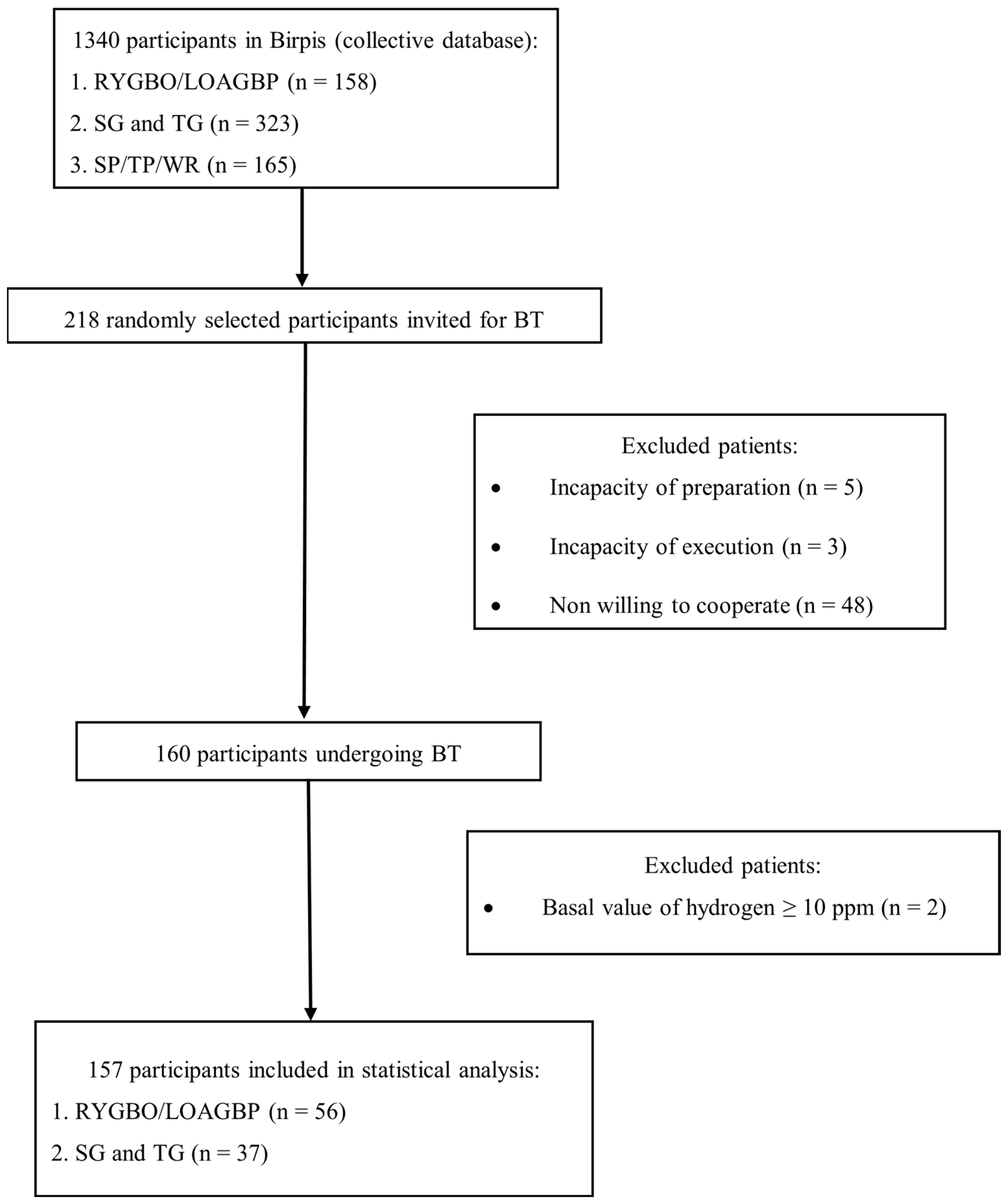 - Coelho, L.K.; Carvalho, N.S.; Navarro-Rodriguez, T.; Marson, F.A.L.; Carvalho, P.J.P.C. Lactulose Breath Testing Can Be a Positive Predictor Before Weight Gain in Participants with Obesity Submitted to Roux-en-Y Gastric Bypass. Obes. Surg. 2019, 29, 3457–3464. [Google Scholar] [CrossRef]