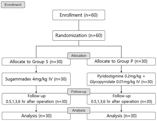 Study flow diagram. Enrollment of 60 pediatric patients (3 to 16 years old) undergoing strabismus surgery (American Society of Anesthesiologists physical status I–II) and their randomization into two groups according to the NMBRD used: Group S received 4.0 mg/kg sugammadex; Group P received 0.2 mg/kg pyridostigmine with 0.01 mg/kg glycopyrrolate.