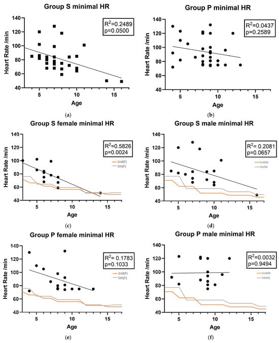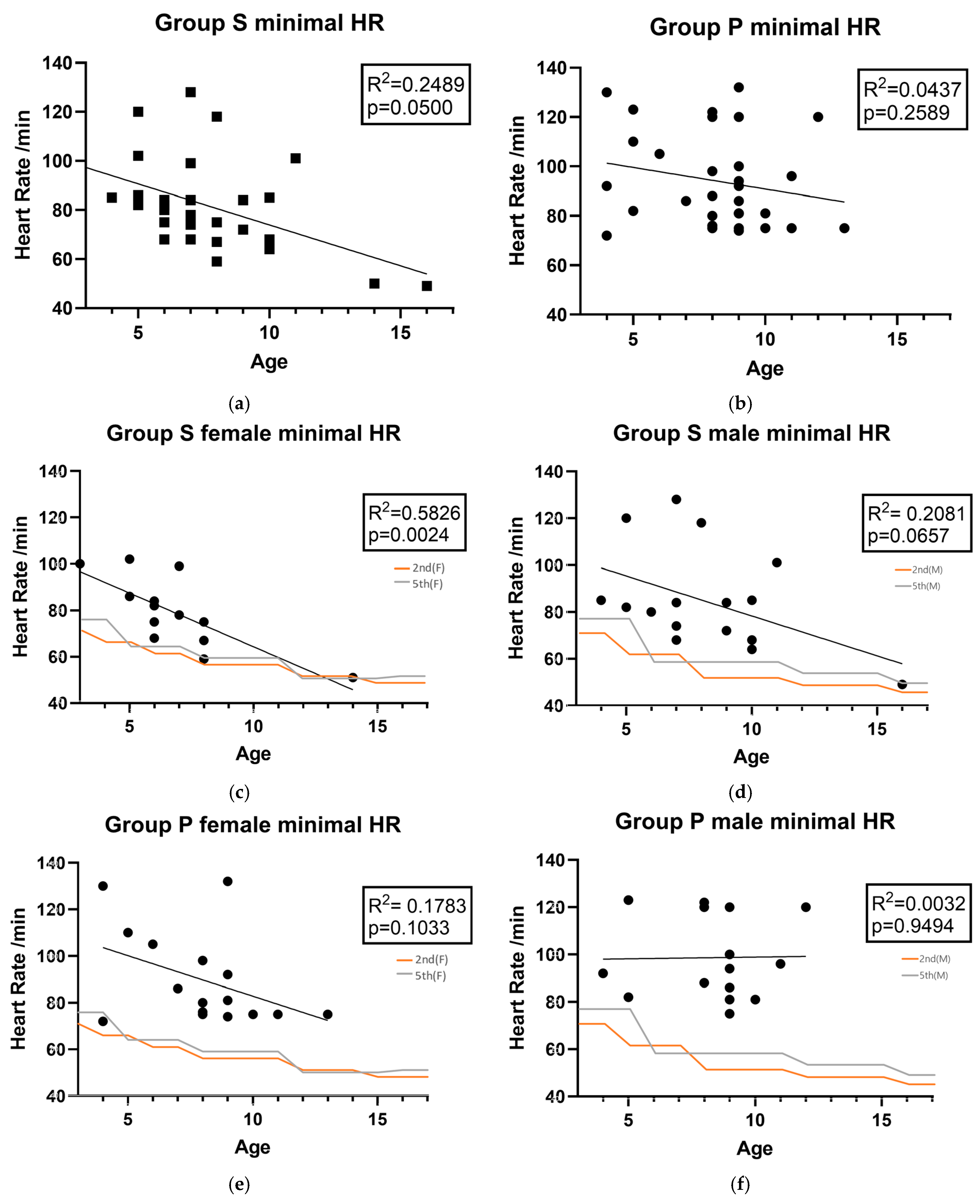 Minimal HR after NMBRD use for each individual and its correlation with sex and age: (a) Group S minimal HR, (b) Group P minimal HR, (c) Group S female minimal HR, (d) Group S male minimal HR, (e) Group P female minimal HR, (f) Group P male minimal HR; Group S, sugammadex; Group P, pyridostigmine bromide with glycopyrrolate. HR, heart rate; NMBRD, neuromuscular blocking reversal drug; 2nd (F), mean second percentile (female), 5th (F), mean fifth percentile (female) 2nd (M), mean second percentile (male), 5th (M), mean fifth percentile (male).
