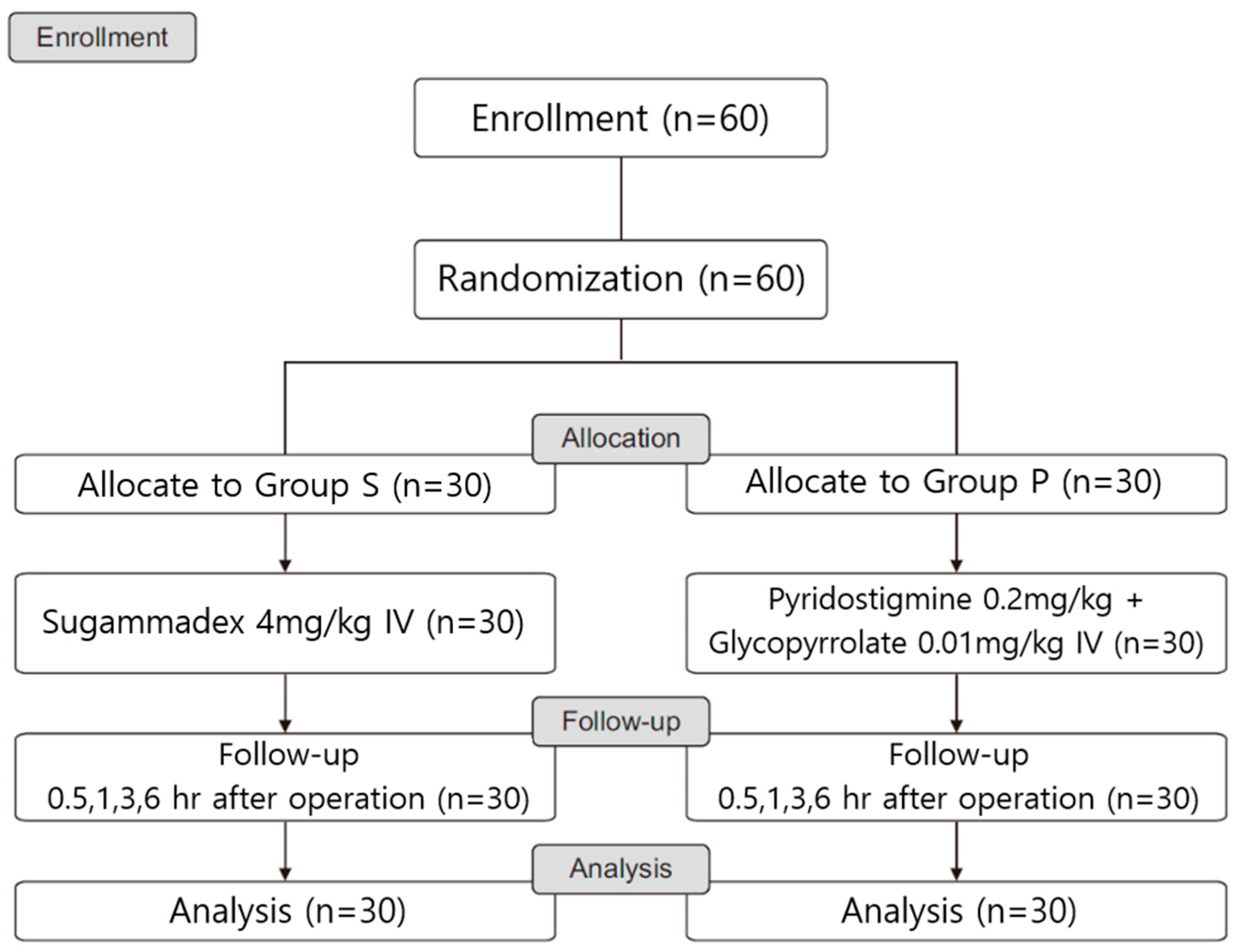 The patients were randomly divided into two groups using a computer-generated random number table, according to the use of the NMBRD, which was administered at the end of general anesthesia (Figure 1). Group S (n = 30) received 4.0 mg/kg of sugammadex (Bridion®, MSD, Seoul, Republic of Korea), and Group P (n = 30) received 0.2 mg/kg of pyridostigmine (Pygmin, Hana Pharm, Seoul, Republic of Korea) with 0.01 mg/kg of glycopyrrolate (Tabinul, Hana Pharm, Seoul, Republic of Korea). The anesthesia nurse prepared the drugs, sugammadex and pyridostigmine with glycopyrrolate, in a 5 ml syringe, blindly. The nurse did not participate in the study room’s anesthesia. Additionally, an anesthesiologist other than the one who obtained informed consent from the study population group administered anesthesia to the patient.