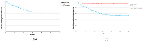 (A) Kaplan–Meier curve of ixekizumab survival. (B) Kaplan–Meier curve of ixekizumab survival according to age.
