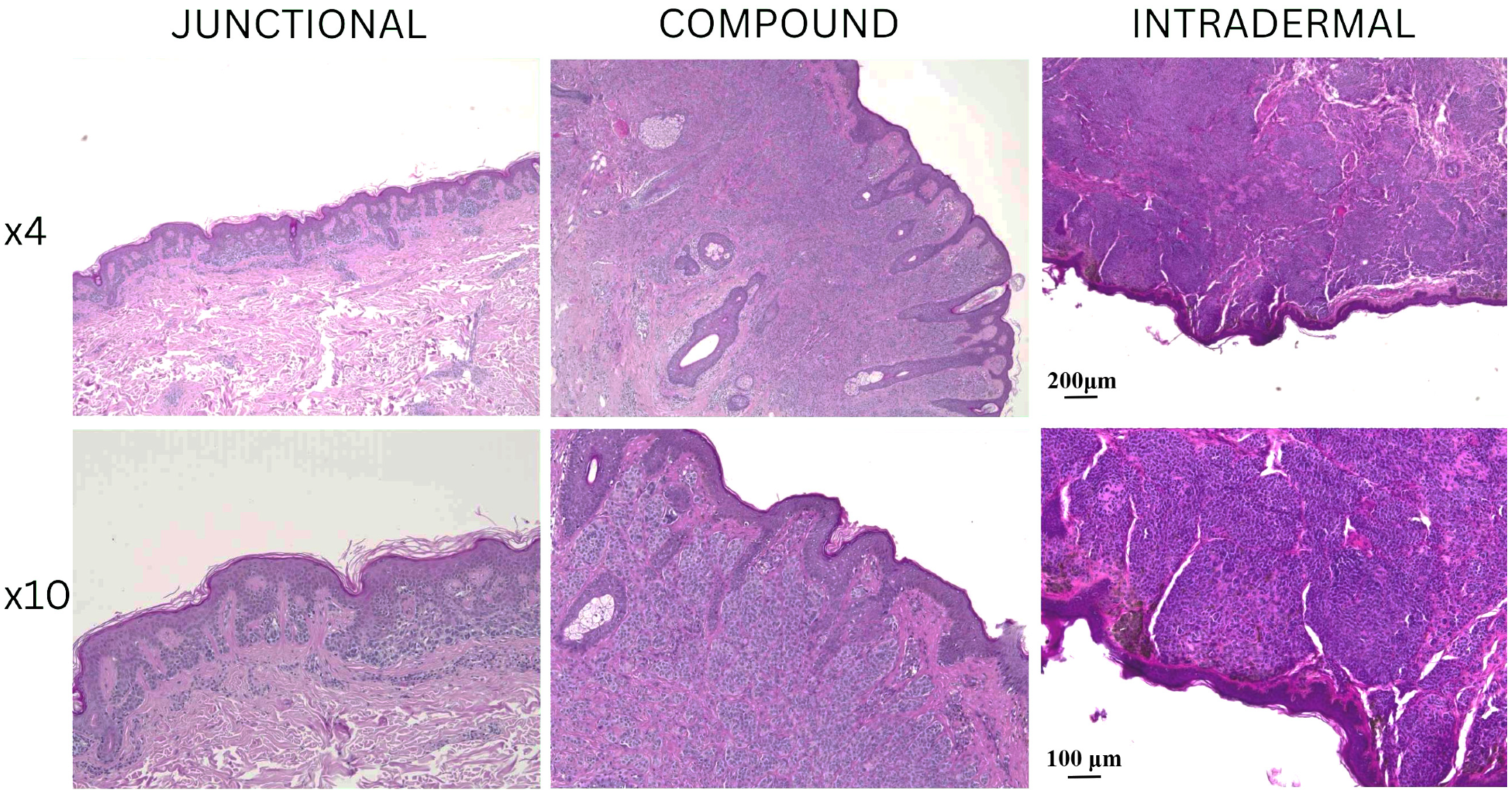 3]. From a histological perspective, melanocytic nevi are categorized based on the depth at which nevus cell nests are found. They are classified into three subtypes: junctional nevi, where nevus cells are confined to the dermal–epidermal junction; compound nevi, which contain nests in both the dermal–epidermal junction and the dermis; and intradermal nevi, in which nevus cells are located exclusively within the dermis. Accurate classification plays a crucial role in differential diagnosis and clinical management [