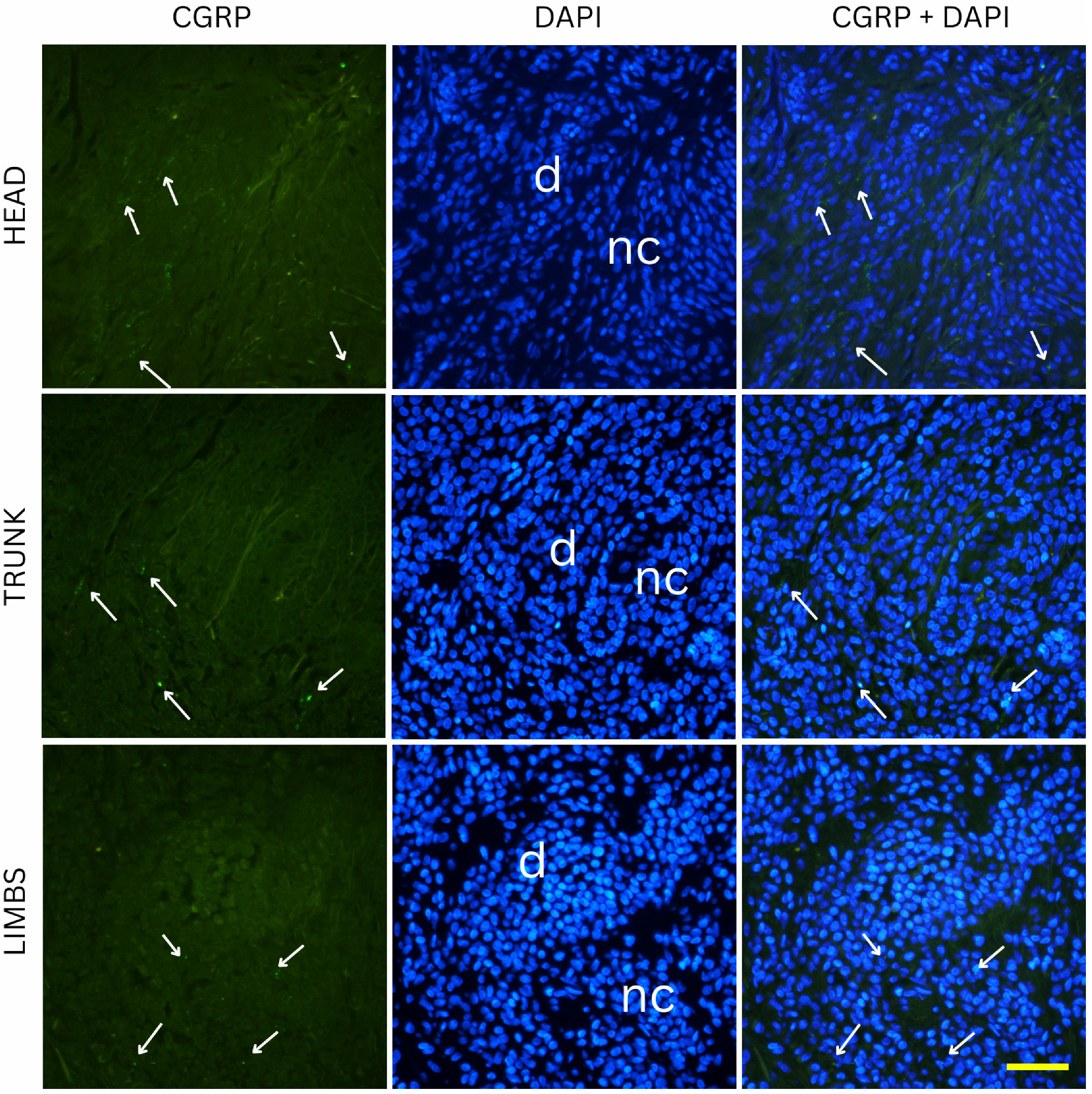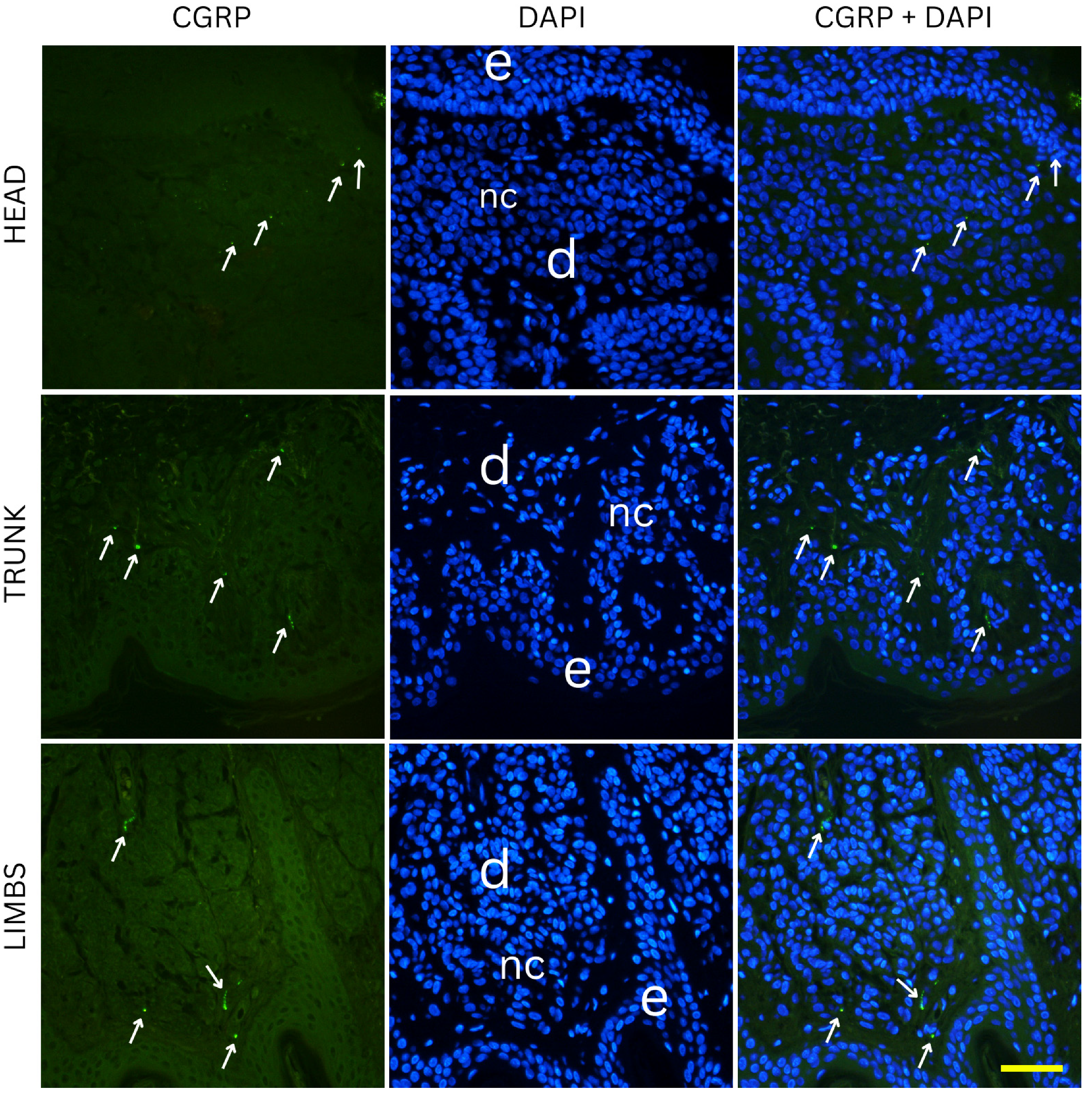12]. In the skin, CGRP-positive fibers are commonly found around blood vessels and adnexal structures, where they contribute to vasodilation and the process of neurogenic inflammation [