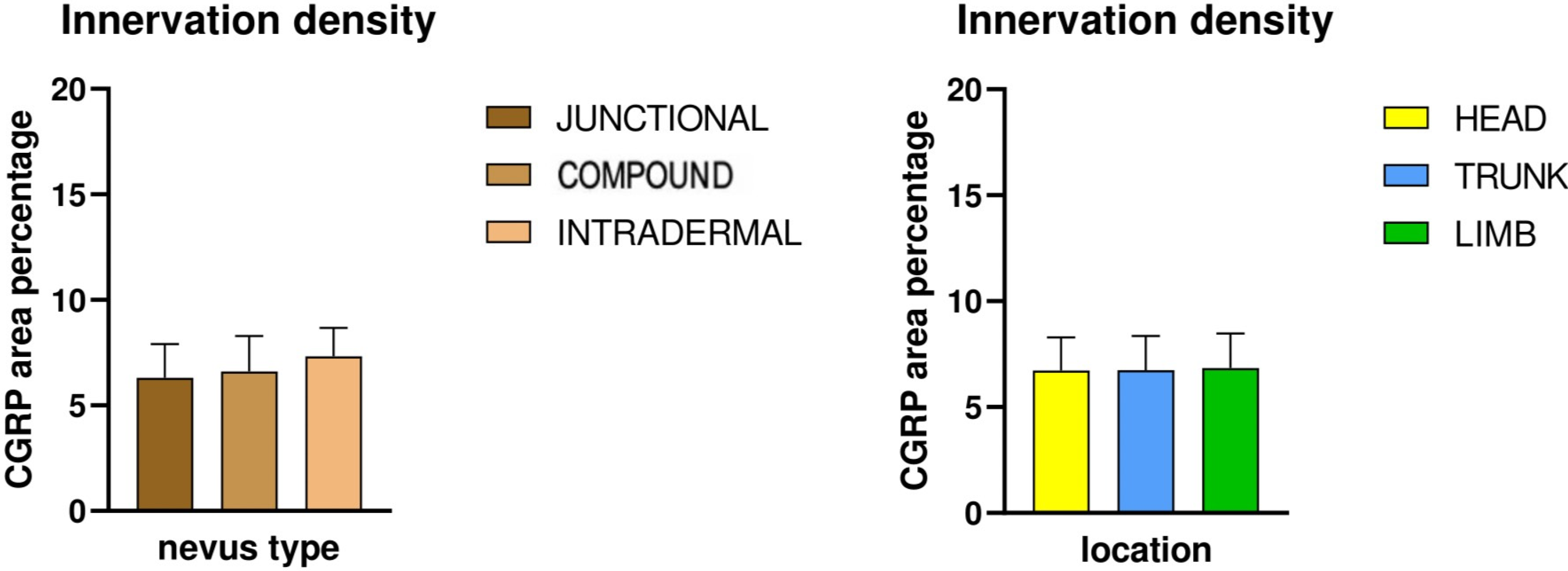 CGRP-positive innervation appeared remarkably uniform across nevus types and anatomical locations in our cohort, in clear contrast to the variability observed with the pan-neuronal marker PGP 9.5. Since CGRP predominantly labels peptidergic nociceptors, which arborize around dermal vessels and adnexal structures and mediate vasodilation and neurogenic inflammation, the absence of significant differences indicates that the overall changes in innervation density are unlikely to be explained by this specific fiber population [
