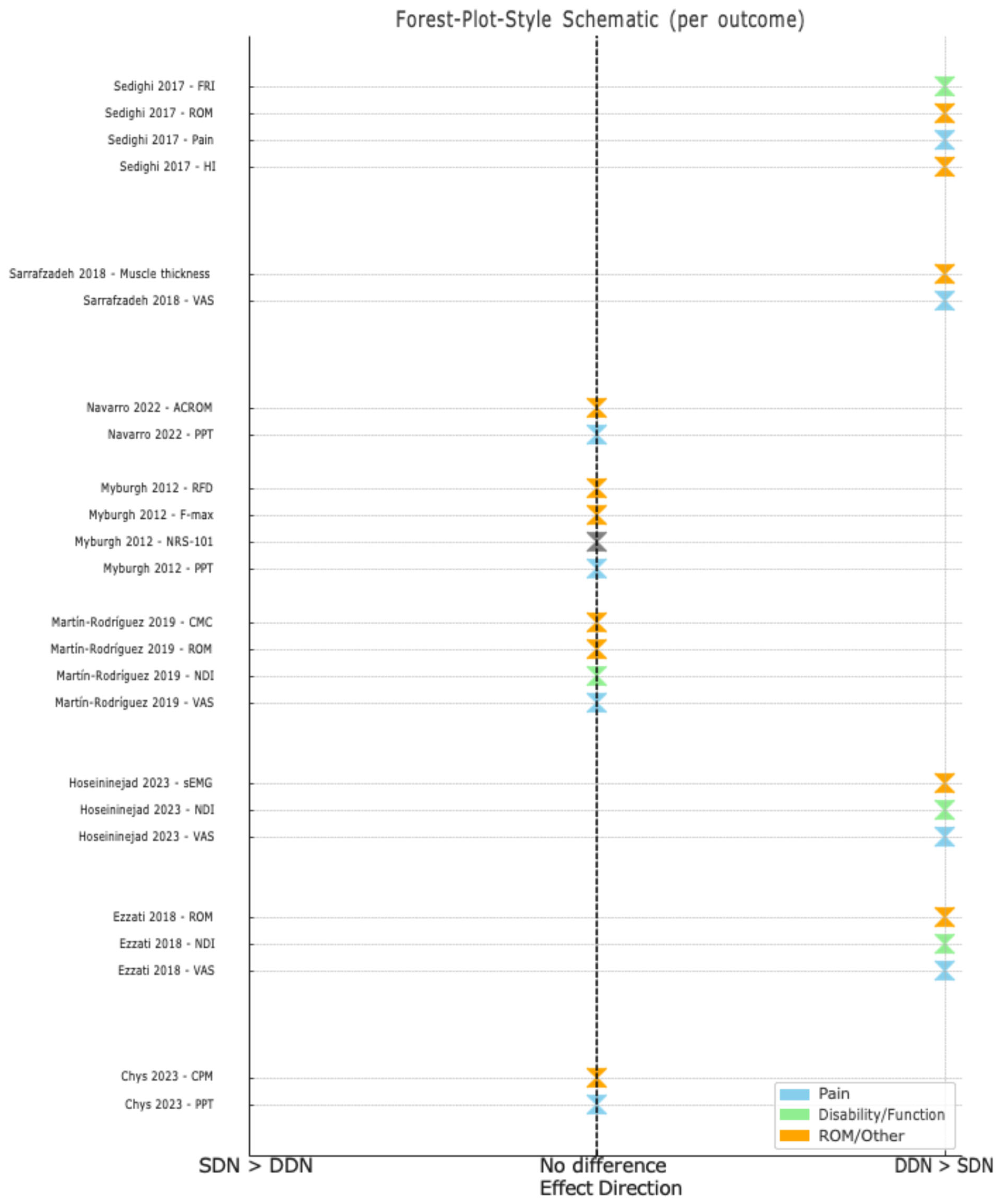 Navarro et al., 2022 [31] | 180 (DDN: 60, SDN: 60, placebo: 60) | Presence of latent MTrPs in the upper trapezius | DDN vs. SDN vs. placebo | 1 session | 1 week | PPT ACROM | Both DDN and SDN improved PPT and ROM over time, but DDN showed better ipsilateral rotation improvement at 7 days. |