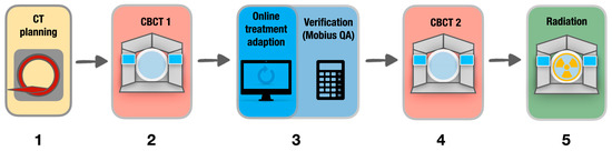 The applied workflow during an online-adaptive treatment session: A planning computed tomography (CT) scan is acquired prior to treatment and serves as the reference for initial planning (1). A daily cone beam CT (CBCT 1) is obtained at the beginning of each treatment session (2). Daily anatomical variations are delineated on this image and used for online-adaptive treatment planning. An independent verification software (Mobius 3D v4, Varian Medical Systems, Palo Alto, CA, USA) is employed to validate the adaptive plans prior to treatment (3). A second CBCT 2 (4) is used to account for intra-fraction motion during the planning period, and the online-adaptive treatment fraction is delivered immediately afterward (5).