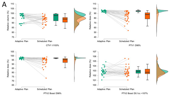 Raincloud and box plot comparison of adaptive (green) and scheduled (orange) treatment plans with respect to key dose–volume histogram (DVH) parameters. Target volume parameters for CTV1, PTV1, and PTV2 (boost) are depicted in panel (A), while organ-at-risk (OAR) dose metrics are shown in panels (B–D). DVH metrics are reported either as dose values corresponding to specific volumes (Dxx%/Dxx cm3) or as volume percentages or absolute volumes receiving defined dose thresholds (Vyy Gy/Vyy%) per fraction.