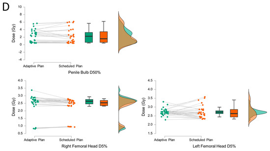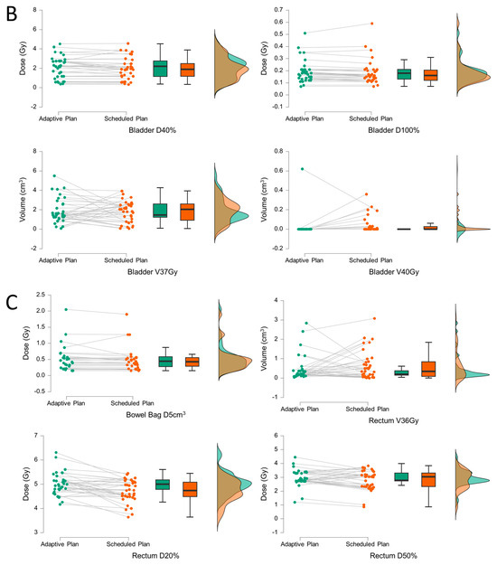 The adaptive and scheduled plans were compared for each fraction (n = 35) using graphical representation (Figure 3) and Wilcoxon signed-rank tests (Table 2). The corresponding dose–volume histogram (DVH) statistics of the targets and OAR can be found in Appendix A.6. A statistically significant improvement was observed in the coverage of CTV1 (V100%, p = 0.01), PTV1 (D98%, p < 0.001), and PTV2 boost (D98%, p < 0.001). Notably, dose “hot spots” within the boost volumes were not more frequent in the adaptive plans (PTV2 D0.1cc < 107%, p = 0.38, Table 2A). Overall, CTV1 V100% was better in 23/35 (65.7%) fractions, PTV1 D98% in 34/35 (97.1%) fractions and PTV2 (Boost) D98% in 30/35 (85.7%) fractions, respectively. With the exception of high-dose areas within the bladder (V40Gy, p = 0.02), no statistically significant reductions in OAR doses were observed in this cohort (Table 2B). The adaptive plan was chosen in 32/35 fractions (91.4%) due to improved target coverage (30/35, 85.7%) and/or reduced OAR dose (12/35, 34.3%). The reasons for selection of the scheduled plan were reduced OAR doses (2/35, 5.7%) or a lack of DVH improvement with the adaptive plan (1/35, 2.9%).