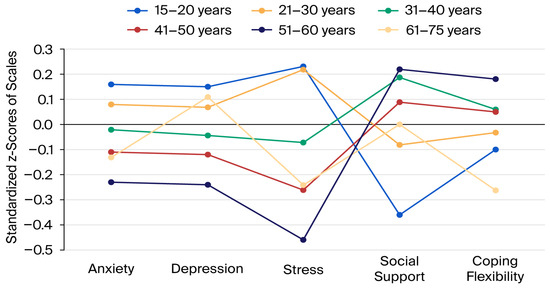 The relationships between the standardised scale scores and age groups are shown in Figure 1. In the 15–20 and 21–30 age groups, the average scores for anxiety, depression and perceived stress were above the mean, while those for perceived social support and coping flexibility were below the mean. In contrast, in the 31–40, 41–50, and 51–60 age groups, the average scores for anxiety, depression and perceived stress were below the mean, while those for perceived social support and coping flexibility were above the mean. In the 61–75 age group, the only score above the average was that for depression.