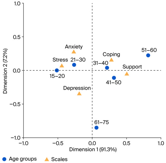 Our correspondence analysis results also revealed a high prevalence of stress and anxiety and a risk for depression among the 15–20 and 21–30 age groups, potentially sharing similarities regarding such mental health problems. The 31–40, 41–50, and 51–60 age groups exhibited a close association with social support and coping flexibility, which might make them more resilient to psychological problems. This result has been attributed to the fact that these age groups generally comprise married individuals with children, those employed in income-generating jobs, those lacking health issues that would significantly impact their social relationships or psychological well-being, and those who have not yet experienced the loss of a spouse or close relative. Lazarus and Folkman also reported that coping mechanisms change with age, that middle-aged individuals can develop more effective coping strategies, and that having more effective social support mechanisms plays a major role in this [60]. Depression was the most relevant factor for the 61–75 age group when compared with all other factors. We believe that, because the elderly population in our study were smartphone users, they could access accurate and reliable information about the pandemic, learn and implement appropriate precautions, and thus, create an environment in which they could protect themselves adequately. This, in turn, might have led to them exhibiting fewer symptoms of stress and anxiety during this period [61]. Moreover, their longevity and maturity can enable them to view life more positively, and the emotional and psychological resilience acquired through their life experiences enables more effective management of anxiety and stress [62]. It was concluded that their influence by depression was not solely due to the pandemic, but rather attributed to a lack of social support and coping flexibility, as well as the high likelihood of chronic diseases affecting their functioning and having experienced a loss of relatives.