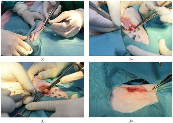 Phases of the surgical procedure followed to insert the titanium implant: (a) incision line and access created to the femural bone; (b) implant hole generated in the femural bone; (c) placement of the implant; (d) closure of the wound.