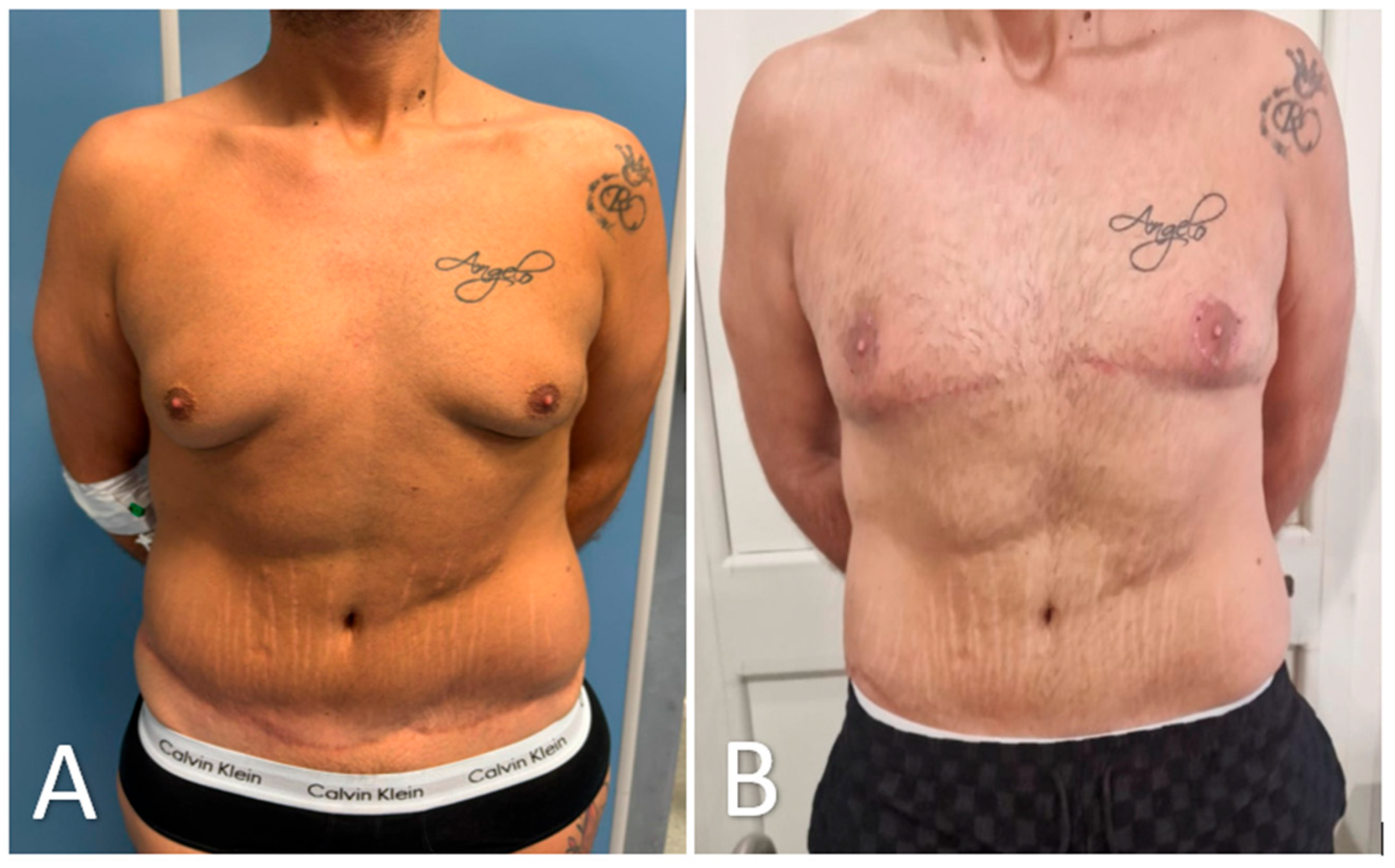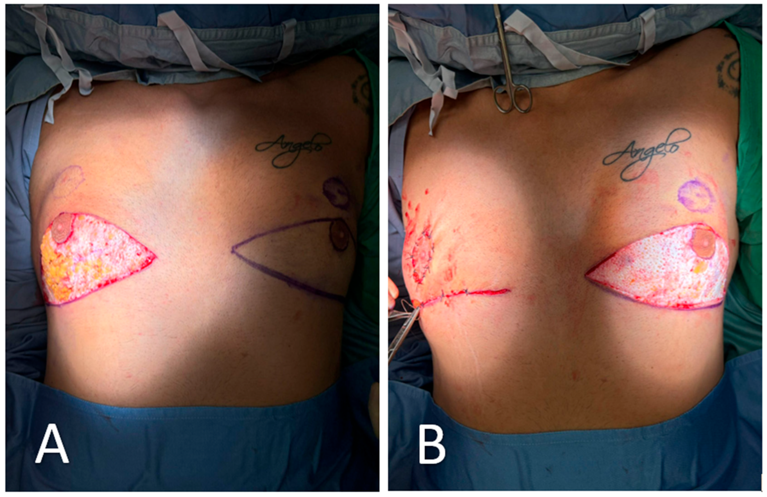 - Novo, R.C.; Reusche, R.; Garcia, O. Subcutaneous Mastectomy and Free Nipple Graft for Gynecomastia. In Operative Dictations in Plastic and Reconstructive Surgery; Anh Tran, T., Panthaki, Z.J., Hoballah, J.J., Thaller, S.R., Eds.; Springer International Publishing: Cham, Switzerland, 2017; pp. 181–183. Available online: https://link.springer.com/chapter/10.1007/978-3-319-40631-2_44 (accessed on 3 August 2025).