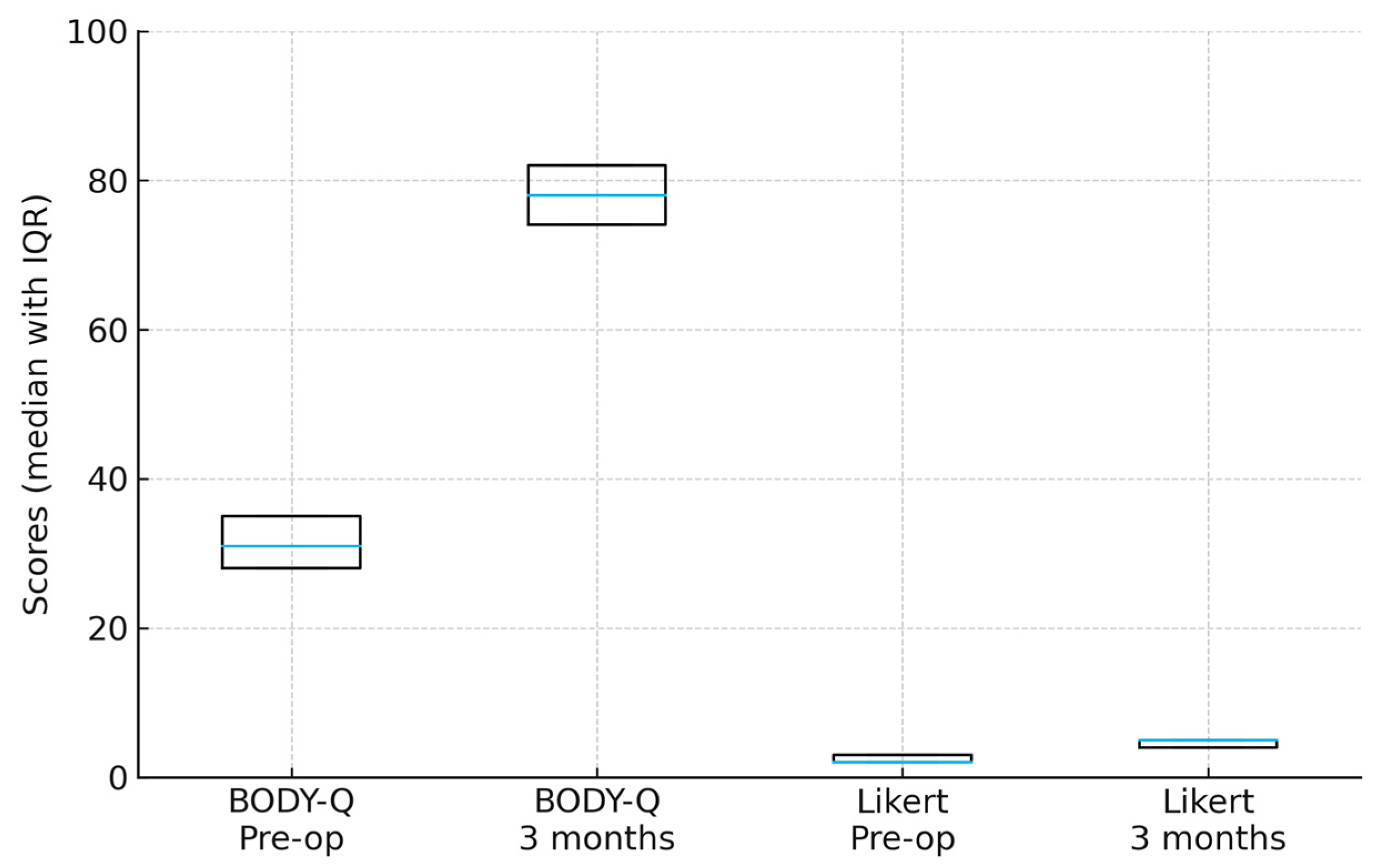 12]. Given the small cohort size, continuous variables were summarized as median with interquartile range (IQR), and paired comparisons (BODY-Q and Likert) were performed using the Wilcoxon signed-rank test, with significance set at