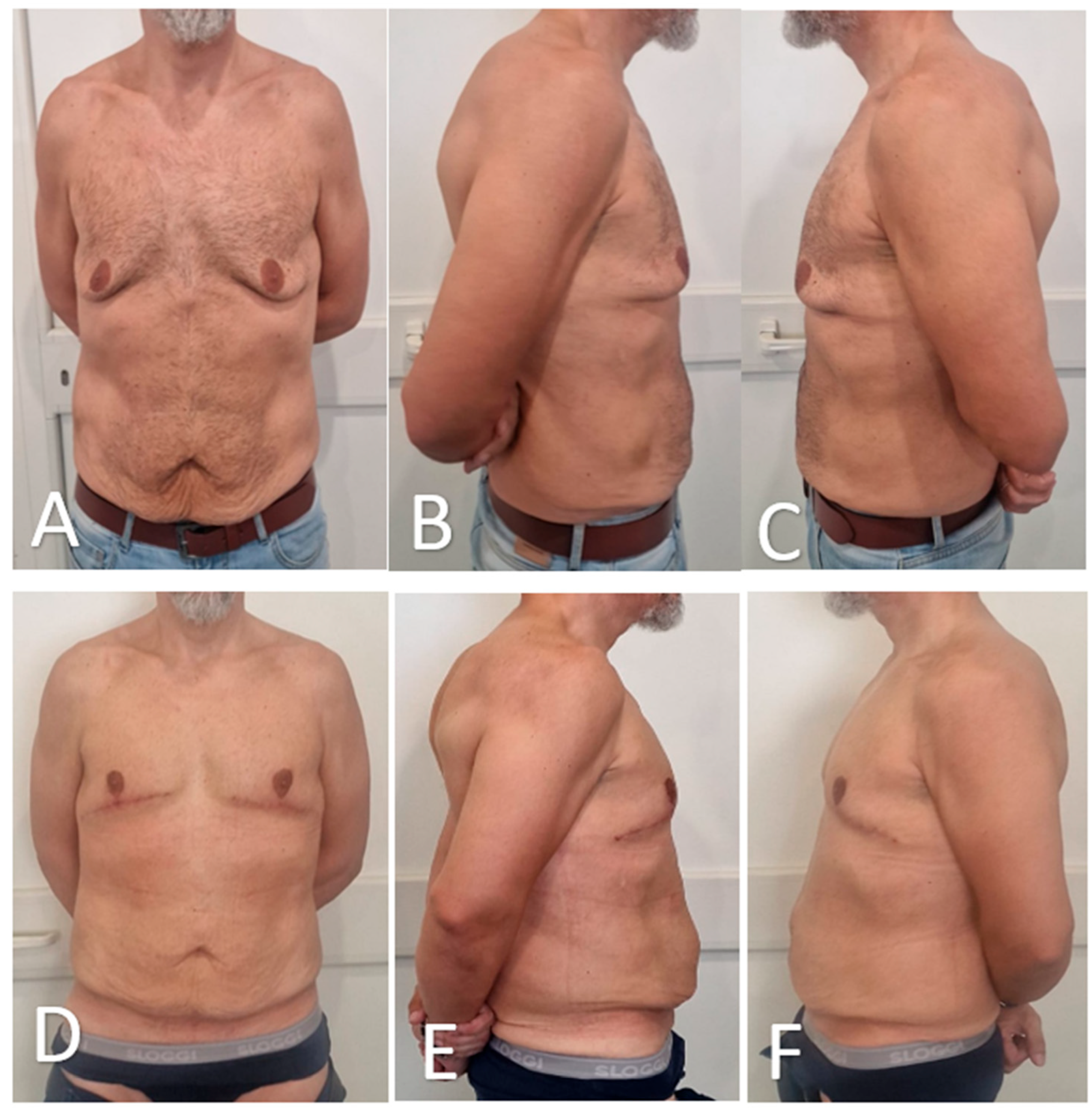 - Barone, M.; Cogliandro, A.; Tsangaris, E.; Salzillo, R.; Morelli Coppola, M.; Ciarrocchi, S.; Brunetti, B.; Tenna, S.; Tambone, V.; Persichetti, P. Treatment of Severe Gynecomastia After Massive Weight Loss: Analysis of Long-Term Outcomes Measured with the Italian Version of the BODY-Q. Aesthet. Plast. Surg. 2018, 42, 1506–1518. [Google Scholar] [CrossRef]