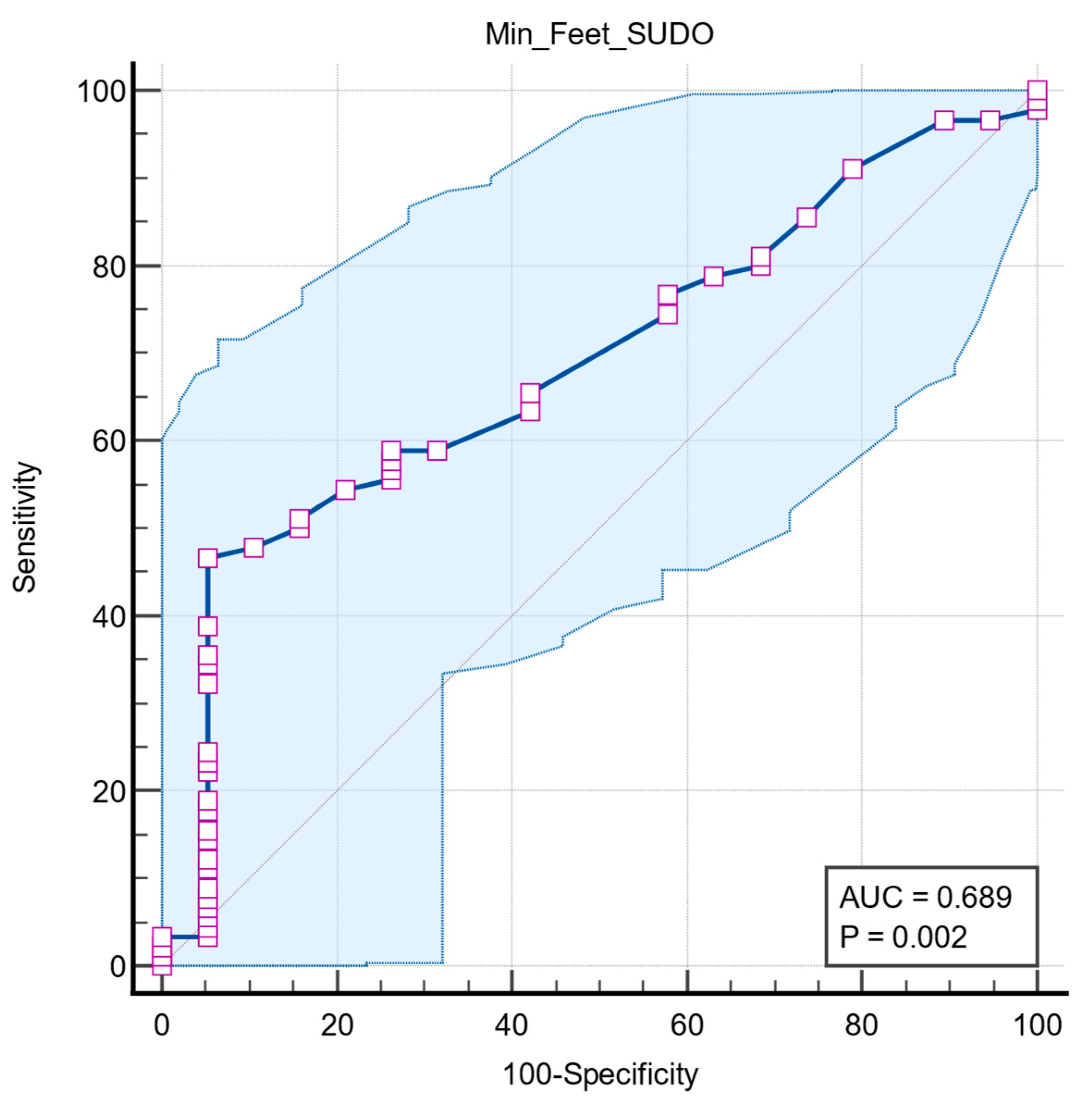 The statistical analysis was conducted using the MedCalc® Statistical Software version 22.015 (MedCalc Software Ltd., Ostend, Belgium). Numerical variables with a Gaussian distribution are described by the mean ± standard deviation (SD), while those with a non-parametric distribution are described by the median and interquartile range [IQR]. Categorical variables were shown as absolute frequencies and percentages. We applied the Shapiro and Wilk method to determine whether the distribution of the numerical variables was normal. In this evaluation, a p-value of less than 0.05 indicates non-parametric distributions. We compared two medians using the Mann–Whitney U test to evaluate the variations between the central tendency indicators. For categorical data, the chi-square test was used, and contingency coefficients were calculated to assess the strength of associations. To assess the prediction power of sudomotor dysfunction, we conducted “receiver-operating characteristics” analyses with performance measured in terms of sensitivity and specificity. The area under the ROC curve (AUC), 95% confidence intervals (CI), and the Youden index (J) were calculated to identify the threshold value. For linear regression analyses, the model assumptions were verified and adequately satisfied. Given the relatively small sample size and the multiple statistical comparisons performed, the results should be interpreted with caution. No formal multiplicity adjustment was applied, but we focused on the primary outcome to minimize the risk of spurious associations.