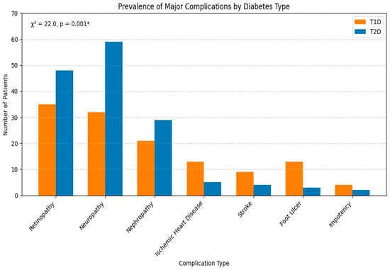 The Najran province, located in southern Saudi Arabia, presents unique demographic and healthcare challenges. With a population of approximately 592,300 inhabitants, the region faces distinct healthcare delivery challenges. The population is characterized by a higher proportion of young individuals, significant rural–urban disparities, and traditional lifestyle patterns that may influence diabetes management and complication development. Although several studies from central and western Saudi Arabia have examined diabetes complications [,], no large-scale research has been conducted in the southern region. Our study aims to fill this gap by separately analyzing complication profiles in T1D and T2D patients, providing comparative insights within the same healthcare setting.